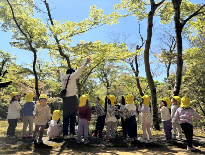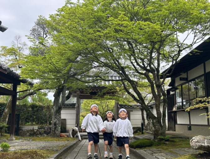 鷹峯の豊かな自然のなかで、お友だちと楽しく遊びます。園内では、広大な芝生広場を駆けまわったり、水や小麦粉などの素材を使って五感を刺激する遊びなどを行っています。