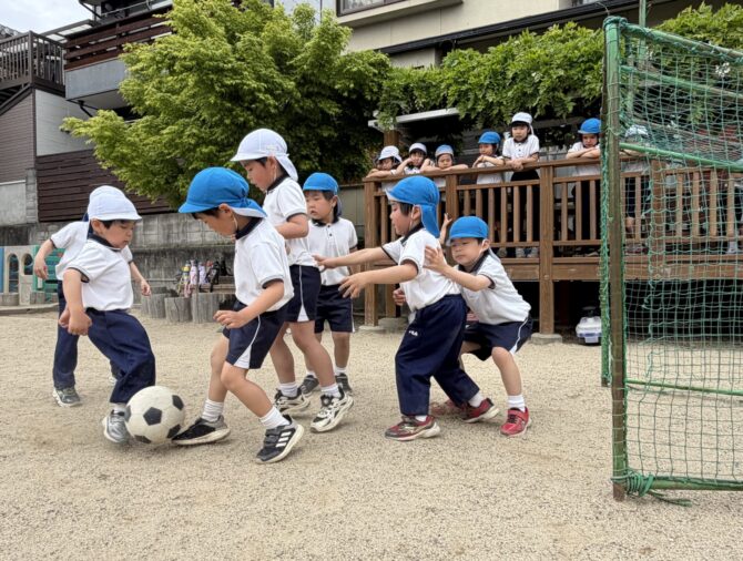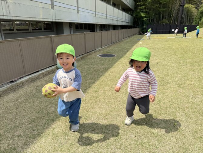 鷹峯の豊かな自然のなかで、お友だちと楽しく遊びます。園内では、広大な芝生広場を駆けまわったり、水や小麦粉などの素材を使って五感を刺激する遊びなどを行っています。