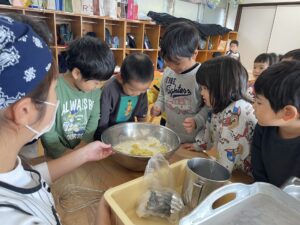 さくら(年少)組のお友だちが11月12日に畑で収穫したさつまいもを使って蒸しパンを作りました!昨日『ばばばあちゃんの なぞなぞ りょうりえほん むしぱんのまき』(さとうわきこ作)の絵本を見て、さつまいもや蒸しパンのクイズをしました♪