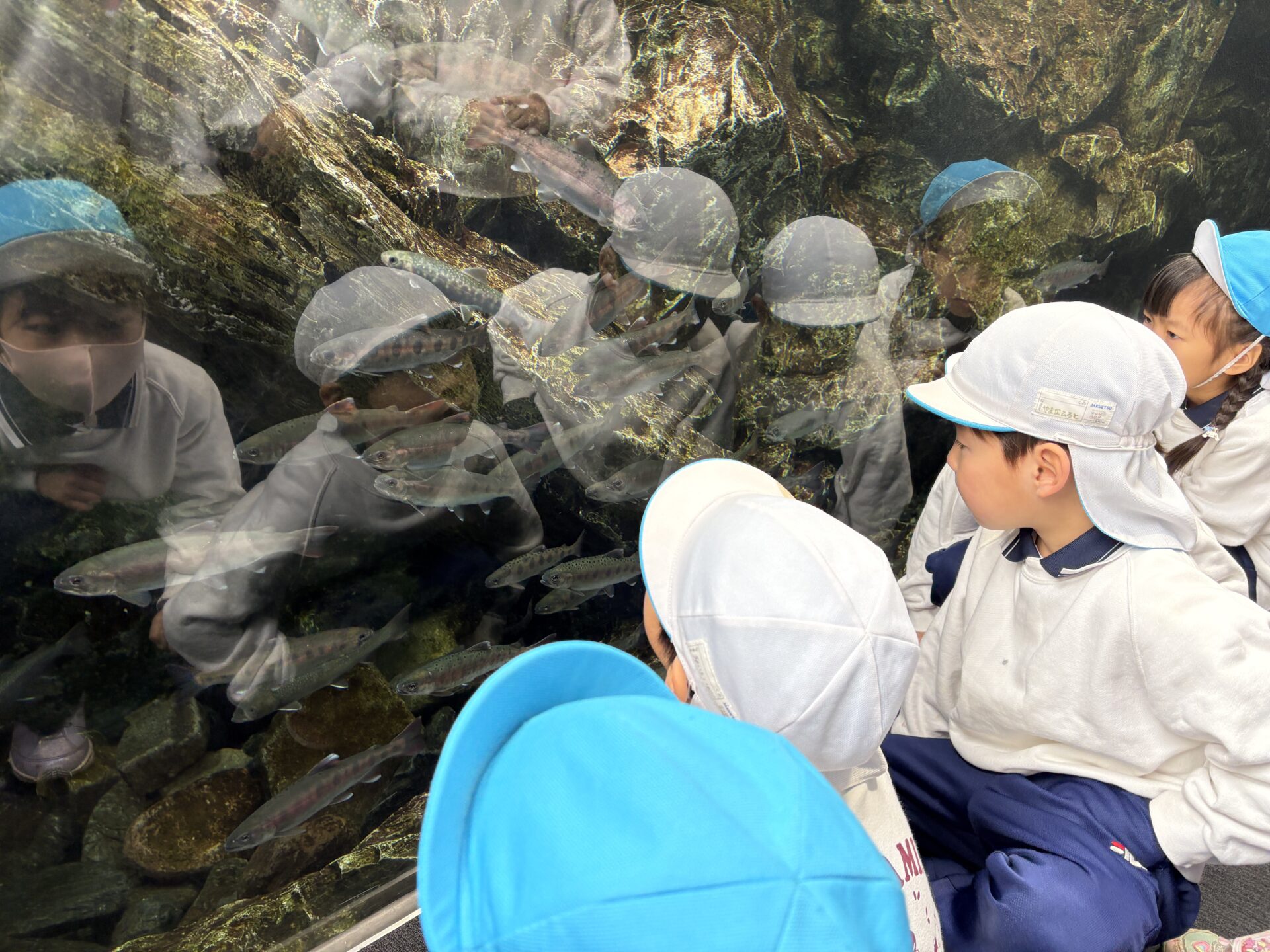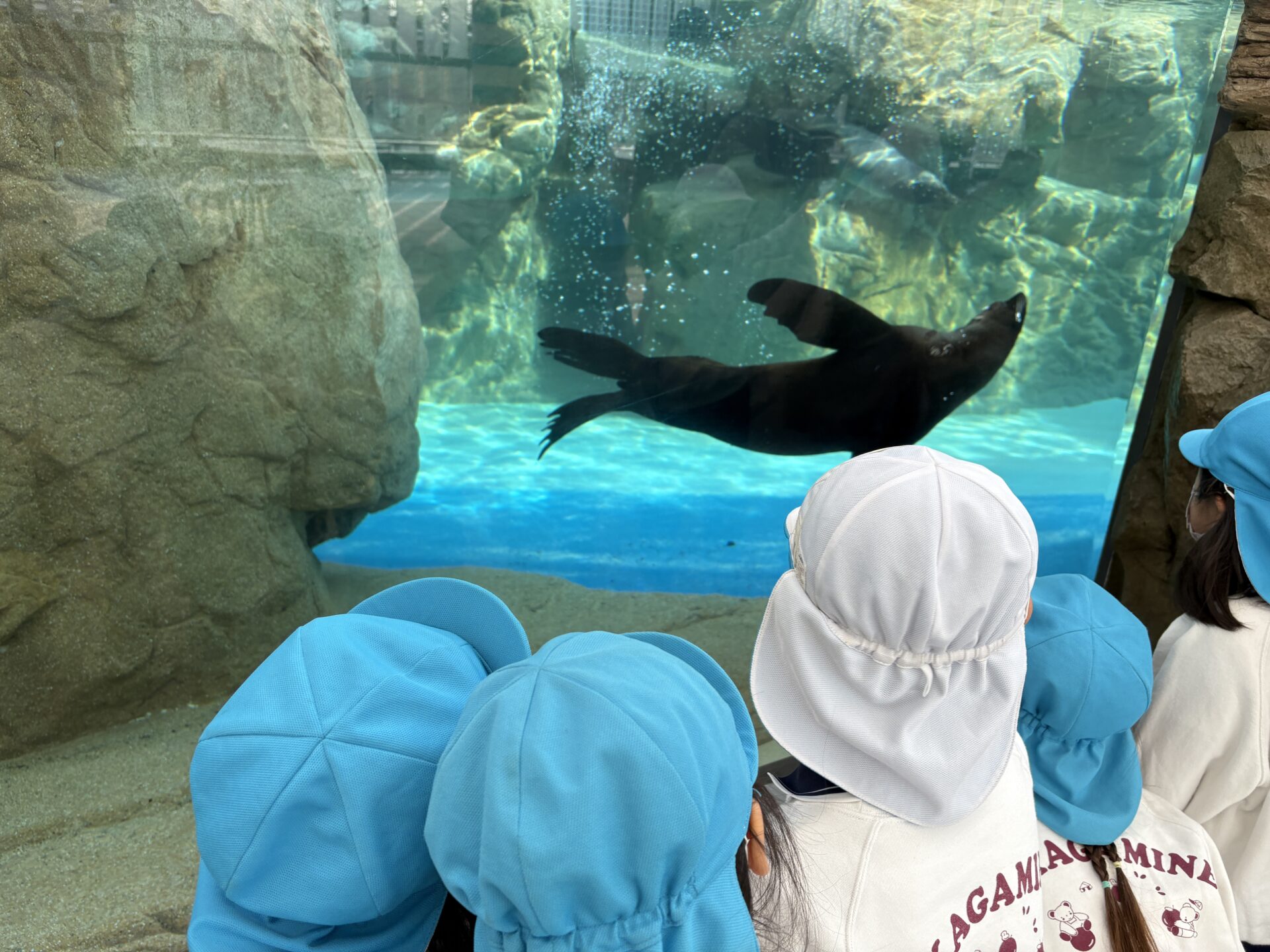 水族館では、初めにオオサンショウウオやオットセイ、ゴマフアザラシを見ました。目の前を大きなオットセイが泳いでいく姿に、「泳ぐの速くてすごいね!」と驚いていました!