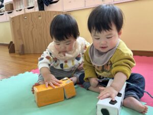 2025.03.07 園日記 手作りおもちゃで遊んだよ☆ たんぽぽ1組(0歳児)のお友だちが先生の作った動物のおもちゃで遊びました。おもちゃを渡すと「わんわん!」と大喜びだったお友だち♪動物についている紐を引っ張ったり、頭をなでたりして楽しみました☆ < 前へ 次へ > お知らせ・ブログ一覧へ