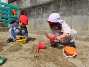2025.04.07 園日記 新しいお砂場セットで遊んだよ♪ ちゅうりっぷ組(2歳児)とさくら(年少)組のお友だちが、新しいお砂場セット(バケツとスコップ)で遊びました☆お砂をぐるぐる混ぜたり、桜の花びらを集めたりして楽しんでいましたよ♪ < 前へ 次へ > お知らせ・ブログ一覧へ