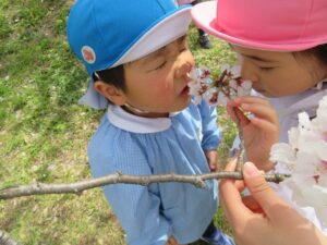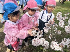 ゆり(年中)組、うめ(年長)組のお友だちが、賀茂川へお花見に行きました。「たくさん咲いてるね♪」と桜並木の下を歩きながら、桜の木に手を伸ばしたり、花びらを拾ったりして楽しんでいました!また、ユキヤナギ、たんぽぽ、カモなど、たくさんのお花や鳥も見ることができ、春の自然を満喫することができました♪