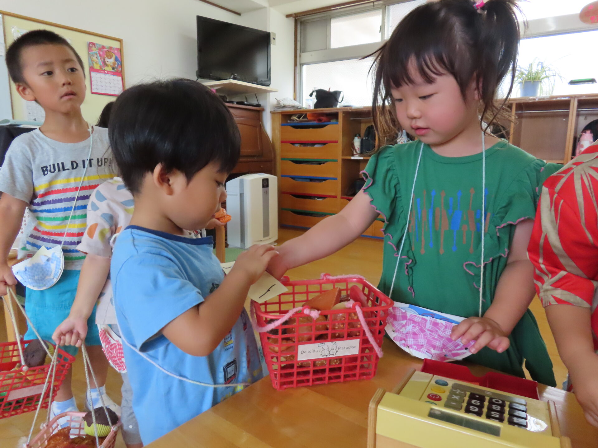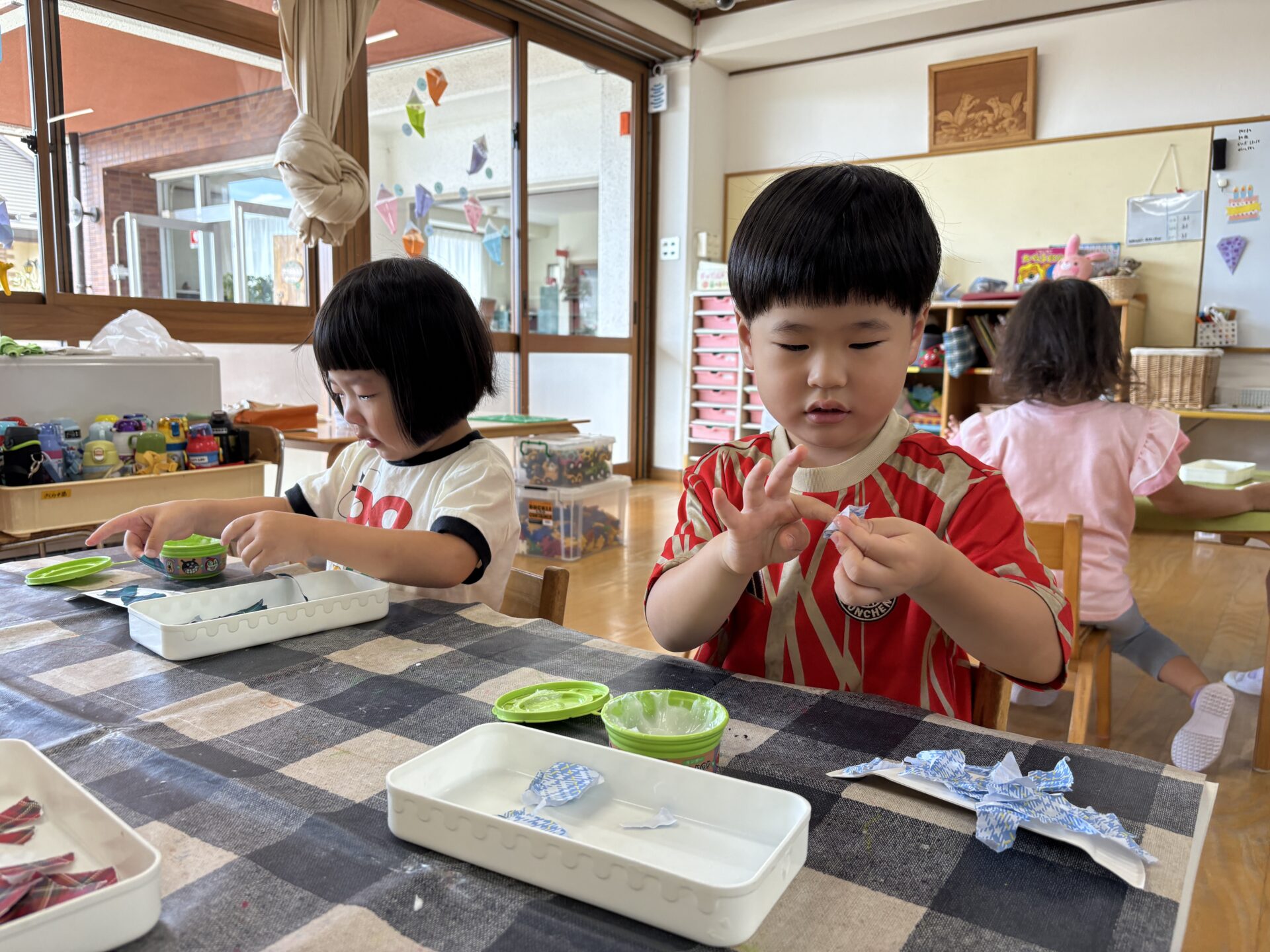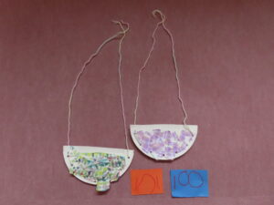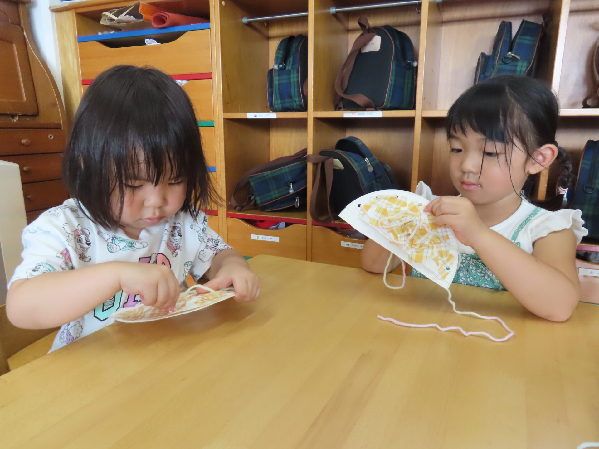 さくら(年少)組のお友だちが、おしゃれなカバンを作りました。まずは、紙皿を半分に切って貼り合わせ、フチに開けた穴に毛糸を通しました。次に、ちぎった包装紙を貼って可愛く飾りつけ!カバンができあがると、お友だち同士で、うれしそうに見せ合いっこをしていました。肩にかけて園内を探検したり、 画用紙で作ったお金を入れて、お買い物ごっこも楽しんでいましたよ♪