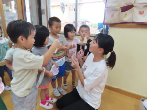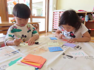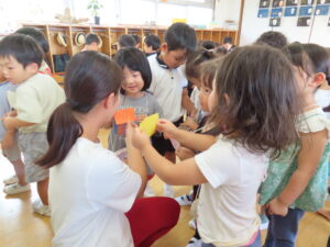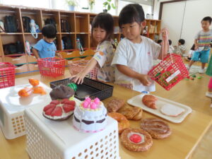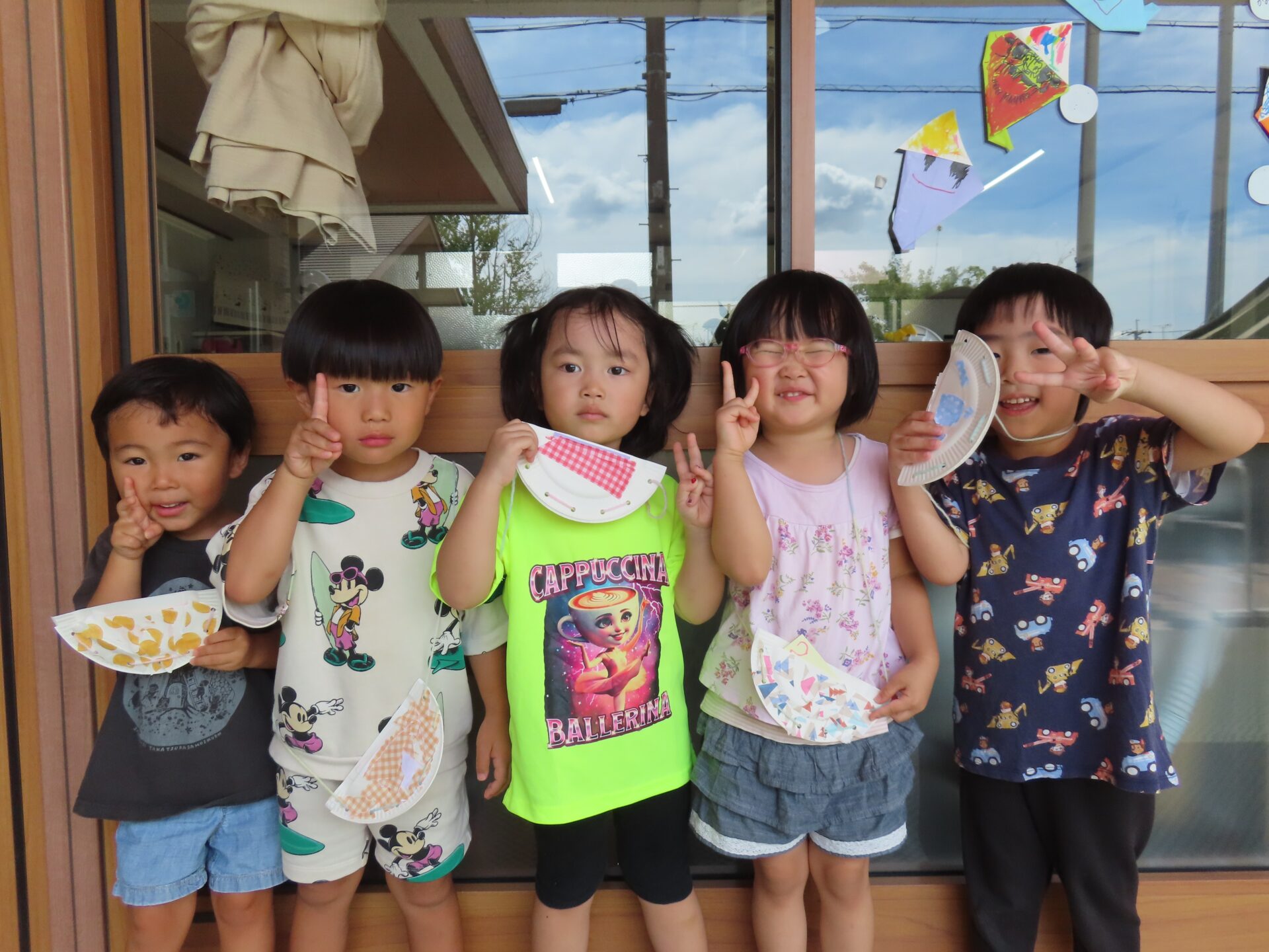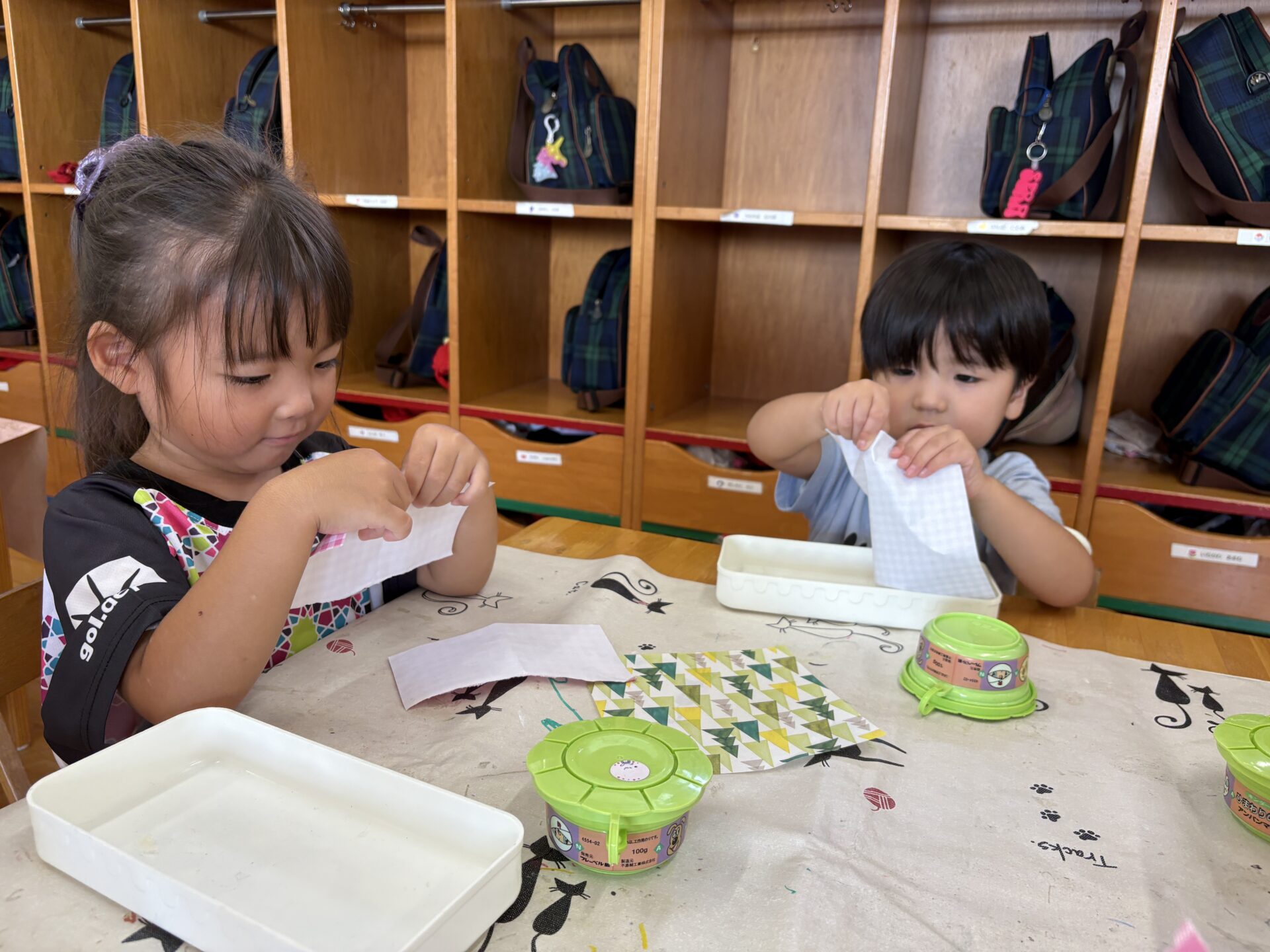 さくら(年少)組のお友だちが、おしゃれなカバンを作りました。まずは、紙皿を半分に切って貼り合わせ、フチに開けた穴に毛糸を通しました。次に、ちぎった包装紙を貼って可愛く飾りつけ!カバンができあがると、お友だち同士で、うれしそうに見せ合いっこをしていました。肩にかけて園内を探検したり、 画用紙で作ったお金を入れて、お買い物ごっこも楽しんでいましたよ♪