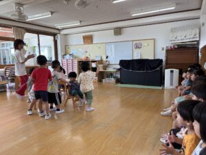 さくら(年少)組のお友だちが、椅子取りゲームをしました。音楽が流れている間は、円形に並べた椅子の周りを歩き、止まったら空いている椅子に急いで座ります。