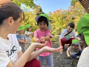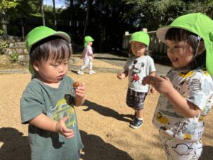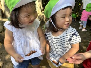 2025.10.08 園日記 どんぐりがいっぱい♪ たんぽぽ2組(1歳児)のお友だちが、妙見宮へお散歩に行きました。大きなどんぐりがたくさん落ちていて、「おっきい!」「あった!」とニコニコ笑顔のみんな☆先生に「どうぞ」と渡してくれたりして、とても楽しんでいました☆ < 前へ 次へ > お知らせ・ブログ一覧へ