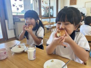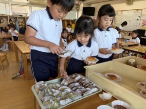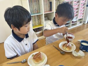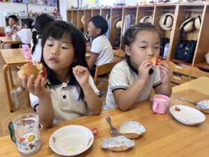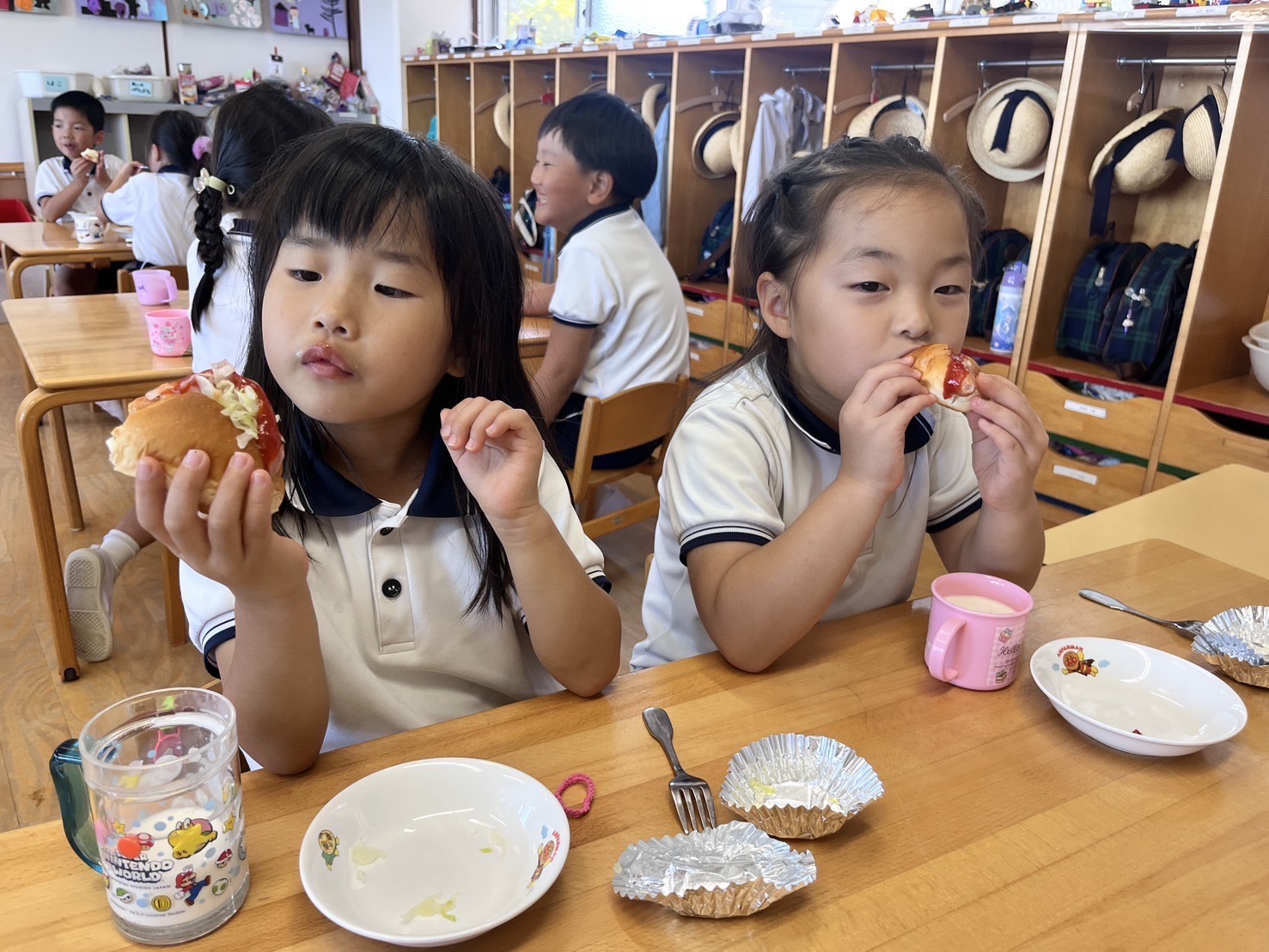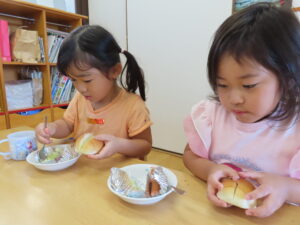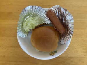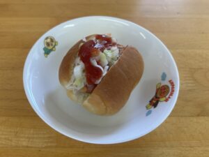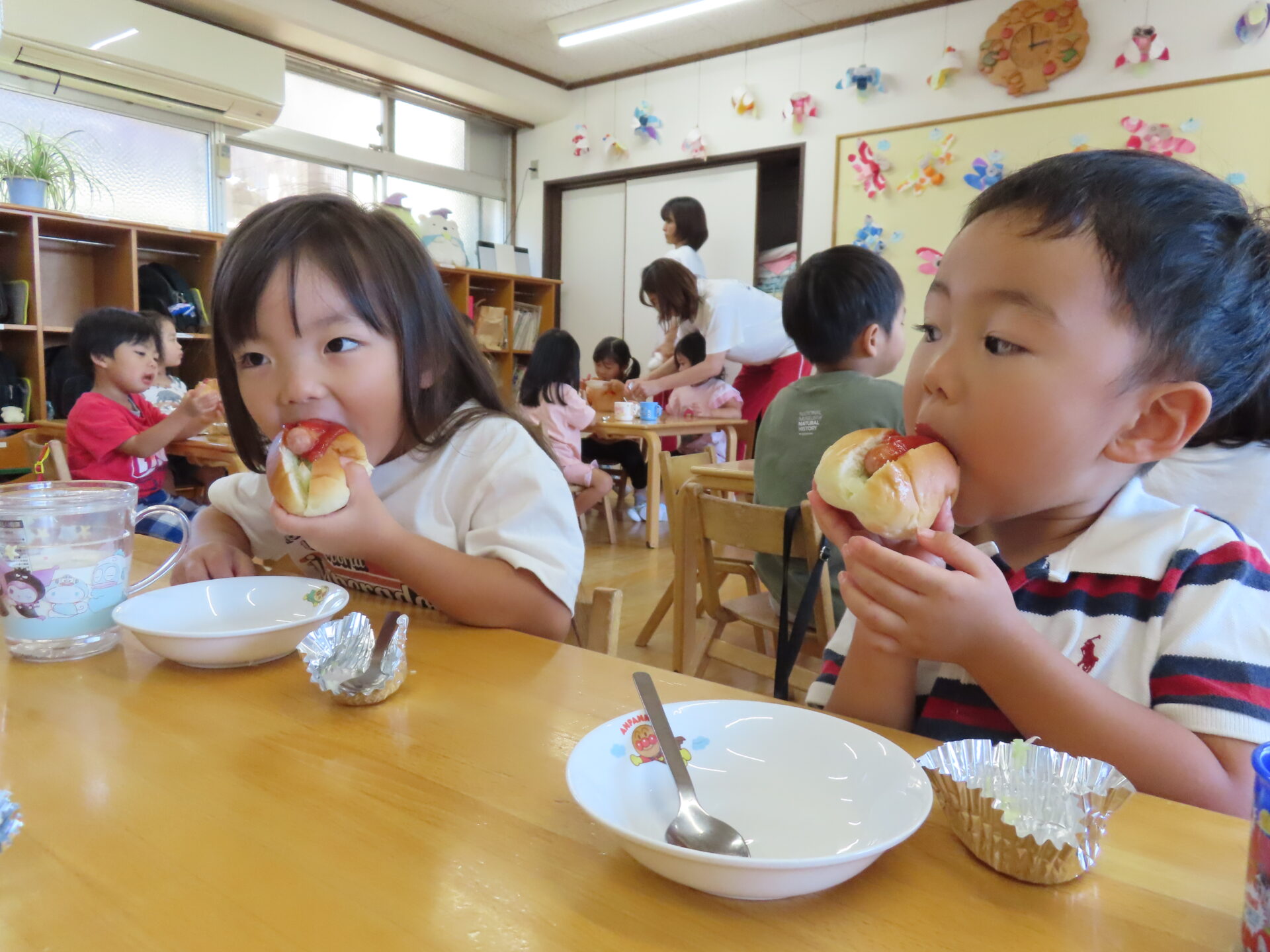 さくら(年少)組、ゆり(年中)組、うめ(年長)組のお友だちが、食体験の一環として、おやつでいただくホットドッグ作りをしました!自分たちでパンにソーセージとキャベツをはさみ、「どうやってはさもうかな?」「おいしそう~!」と目を輝かせながら作っていた子どもたち☆出来上がると、「いいにおい!」と嬉しそうな笑顔があふれていました。自分で作ったホットドッグの味は格別で、おいしくて楽しい食体験となりました♪