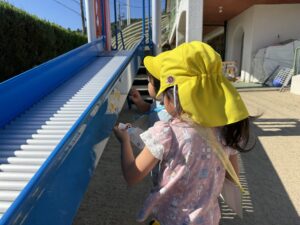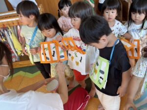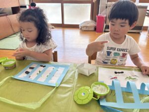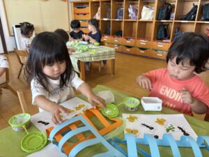 今日は、お部屋で画用紙で作った虫かごに、昨日捕まえた虫をペタペタ…☆「みてこんなにいっぱい~」「たくさん貼ったよ!」と、お友だちや先生に嬉しそうに見せていたみんなでした☆