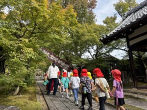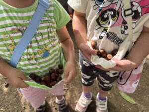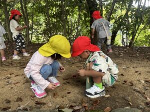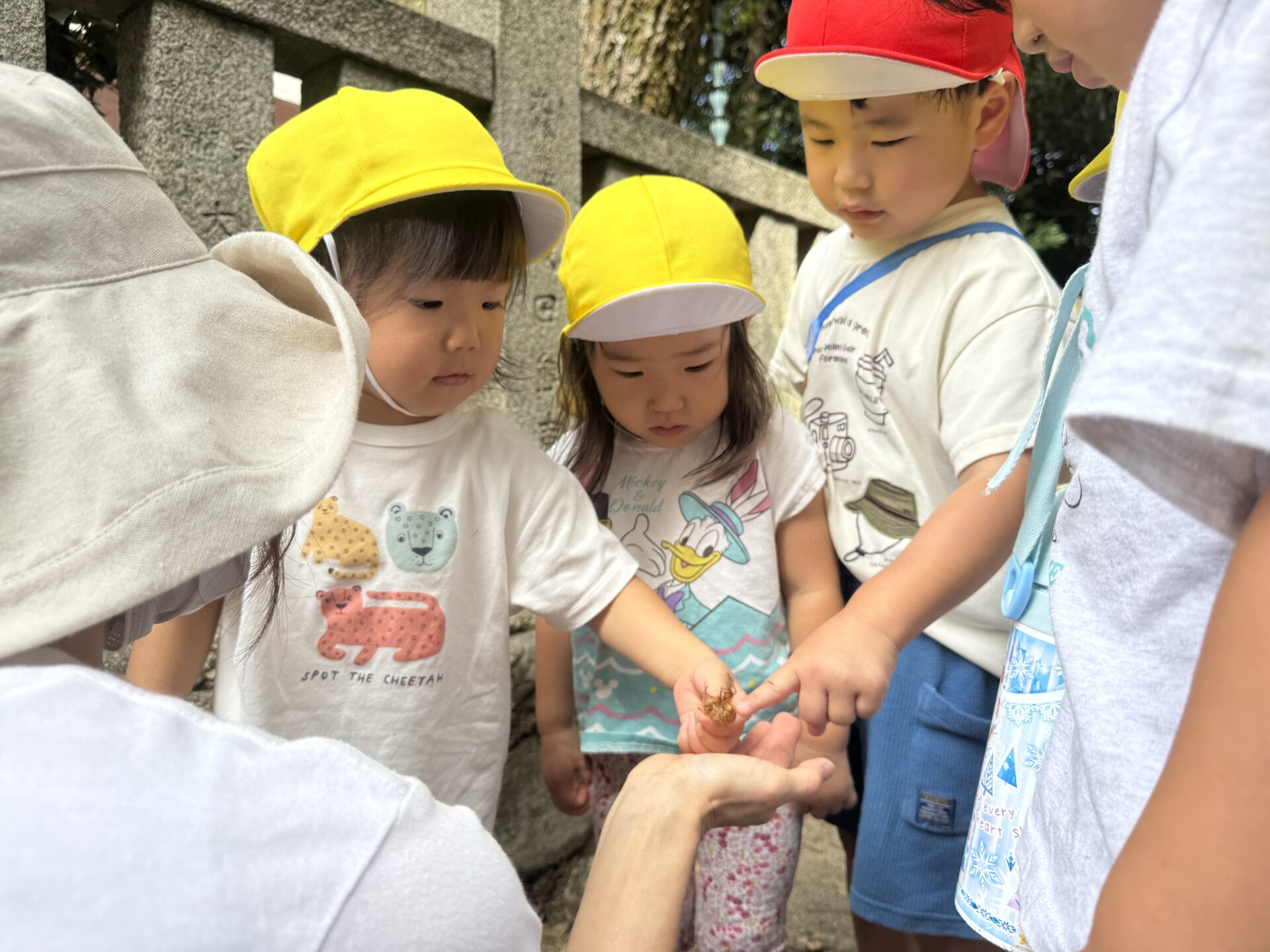 ちゅうりっぷ組(2歳児)とさくら(年少)組のお友だちが、妙見宮へどんぐり拾いに行きました。境内には大きなどんぐりがたくさん落ちていて、「ここにいっぱいあるよ!」「あっちにもある!」と目を輝かせながら拾っていました☆また、セミの抜け殻を見つけると「これなに?」とさくら組のお兄さん、お姉さんに質問したり、拾ったどんぐりを見せ合ったりしていました。