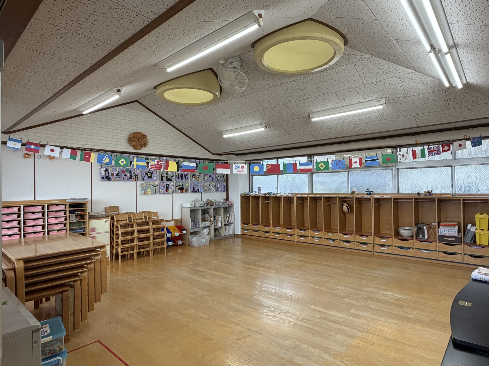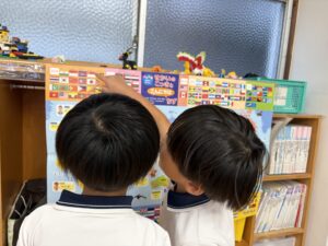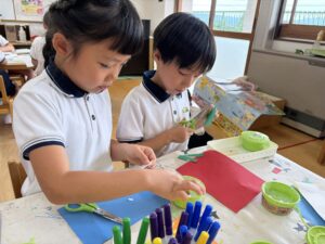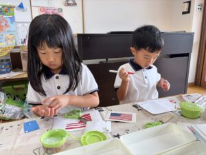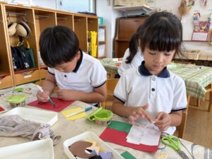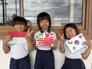 運動会に向けて鉄棒や跳び箱の練習を頑張っているうめ(年長)組のみんな。「運動会や万博で国旗が飾ってあるの見たことあるよ!」という声から、国旗を作ってみることにしました。国によって旗の模様や色が違うことを知った子どもたちは、「私はアメリカにしよう!」「韓国、難しそうだけどやってみたい!」とお話ししながら、画用紙を細かく切ったり貼ったりして、夢中で制作を楽しんでいました♪