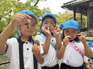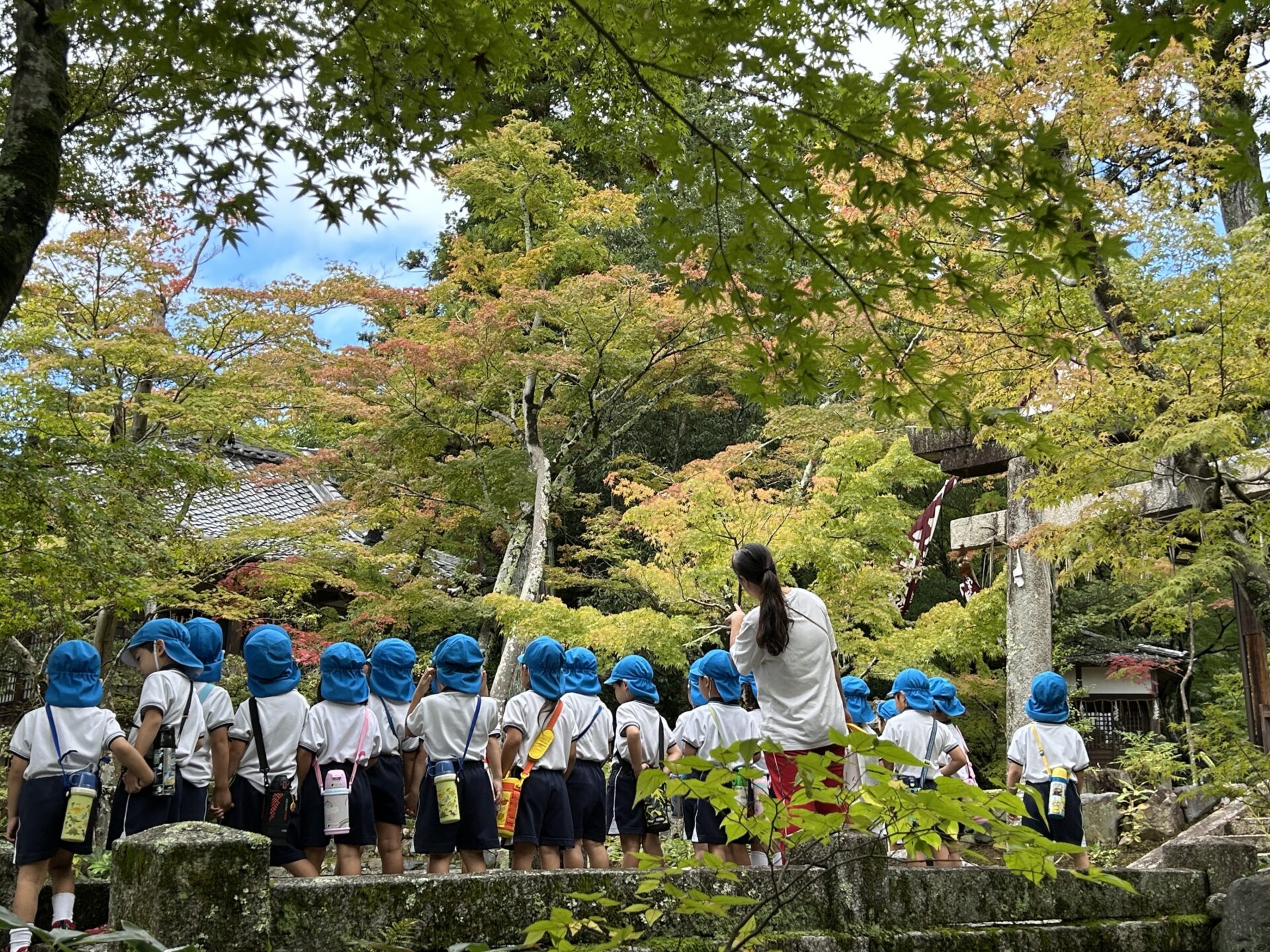 ゆり(年中)組のお友だちが、妙見宮へどんぐり拾いに行きました。境内のもみじも少しずつ色づきはじめ、「色が変わってるね!」「秋だね~」と、季節の移り変わりを感じながら歩く子どもたち☆