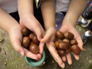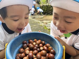 「今日もいっぱい落ちてるね!」と目を輝かせながら、手のひらいっぱいにどんぐりを集めていました♪秋の自然に触れながら、楽しい時間を過ごしました。