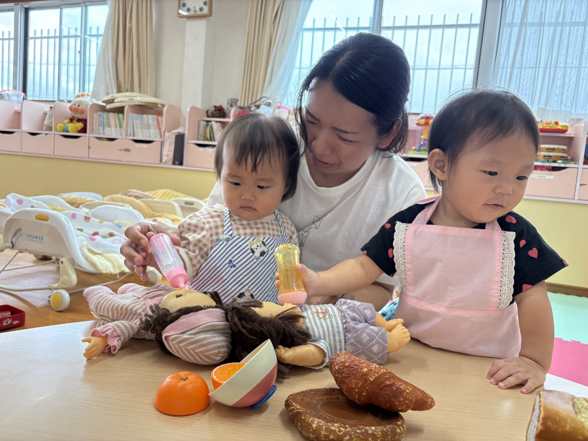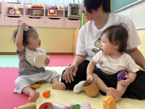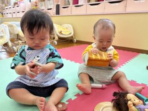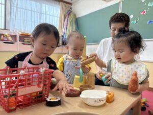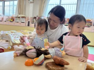 たんぽぽ1組(0歳児)のお友だちがおままごとをして遊びました。かわいくエプロンをつけて先生と一緒にお人形にミルクをあげたり、カゴの中に食べ物を入れている姿が見られました!先生やお友だちとやり取りを楽しみながら、にこにこと遊ぶ子どもたちでした♪