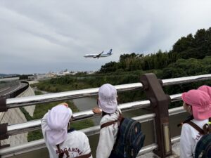 千里川の土手では、頭のすぐ上を飛行機が飛んでいく迫力にびっくり!「ぶつかっちゃう~!」「おっきい音~!」と目を丸くしながら、その迫力を全身で感じていました。