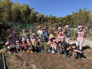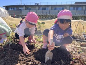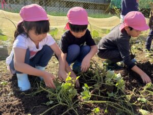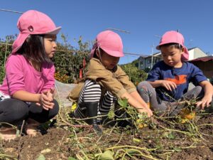 うめ(年長)組のお友だちが芝生広場の横の畑でお芋掘りをしました☆スコップで土を掘ると、さつまいもがコロコロ♪「ここにもおいもがあるよ!」「大きいの出てきた!」と夢中になって掘り進めていたみんなでした。