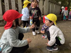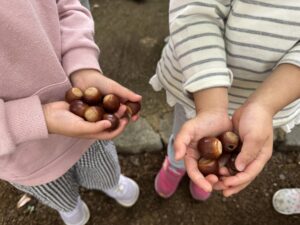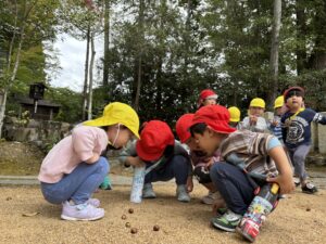 ちゅうりっぷ組(2歳児)、さくら(年少)組のお友だちが、妙見宮へどんぐり拾いに行きました。大きなどんぐりをたくさん見つけると、「こんなに大きいのあったよ!」「こっちにもある!」とうれしそうにお話ししながら夢中になって探していました☆