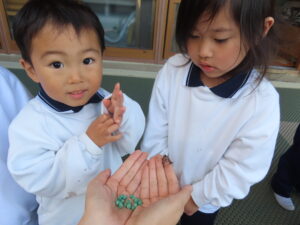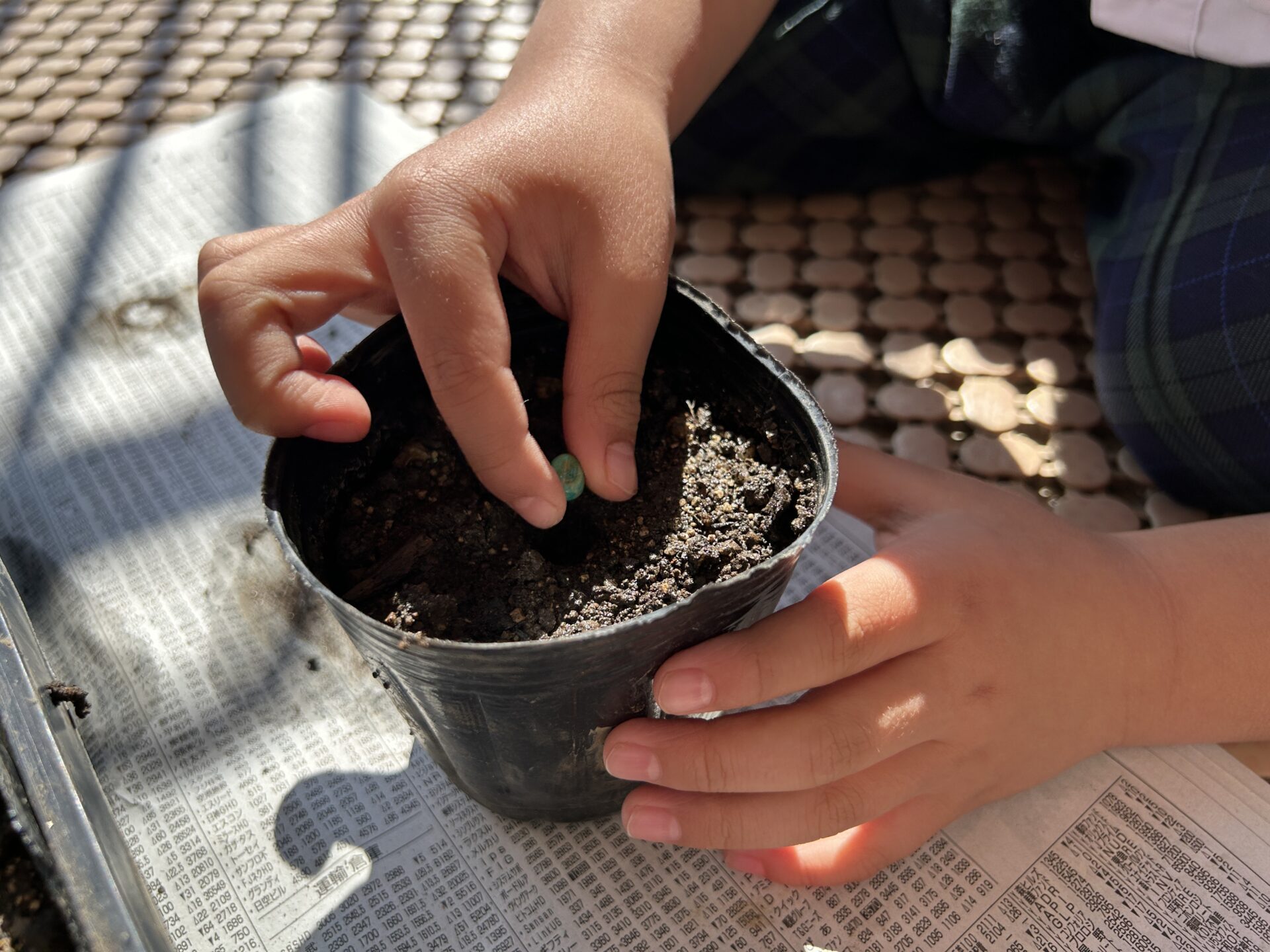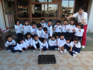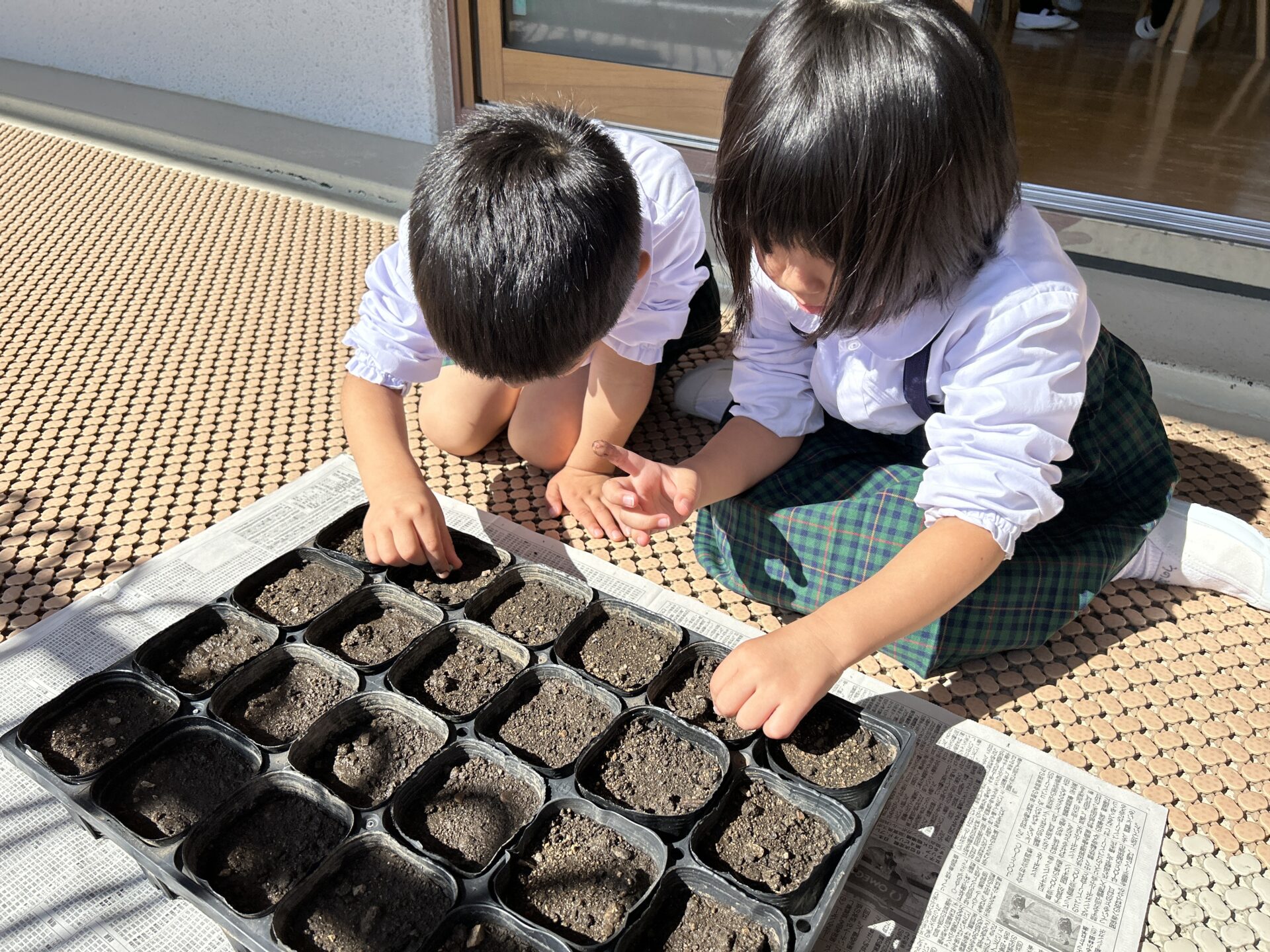 さくら(年少)組、ゆり(年中)組のお友だちがスナップエンドウ豆の種まきをしました。小さな種をそっと土に入れ、「おいしいお豆ができますように!」「おおきくなあれ!」とお話しながらこれからの成長を楽しみにしていました♪エンドウ豆は、来年の5月頃に収穫できます。