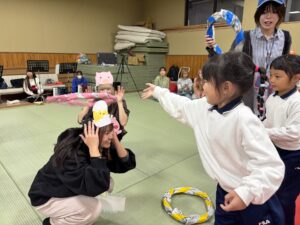 はじめに、大阪・関西万博のオフィシャルテーマソング『この地球の続きを』に合わせて、歌やダンスを披露してくださり、会場は一気に明るく楽しい雰囲気に包まれました。そのあとは、輪投げやジェットコースター、空飛ぶじゅうたんなど、ワクワクするような催しが盛りだくさん!