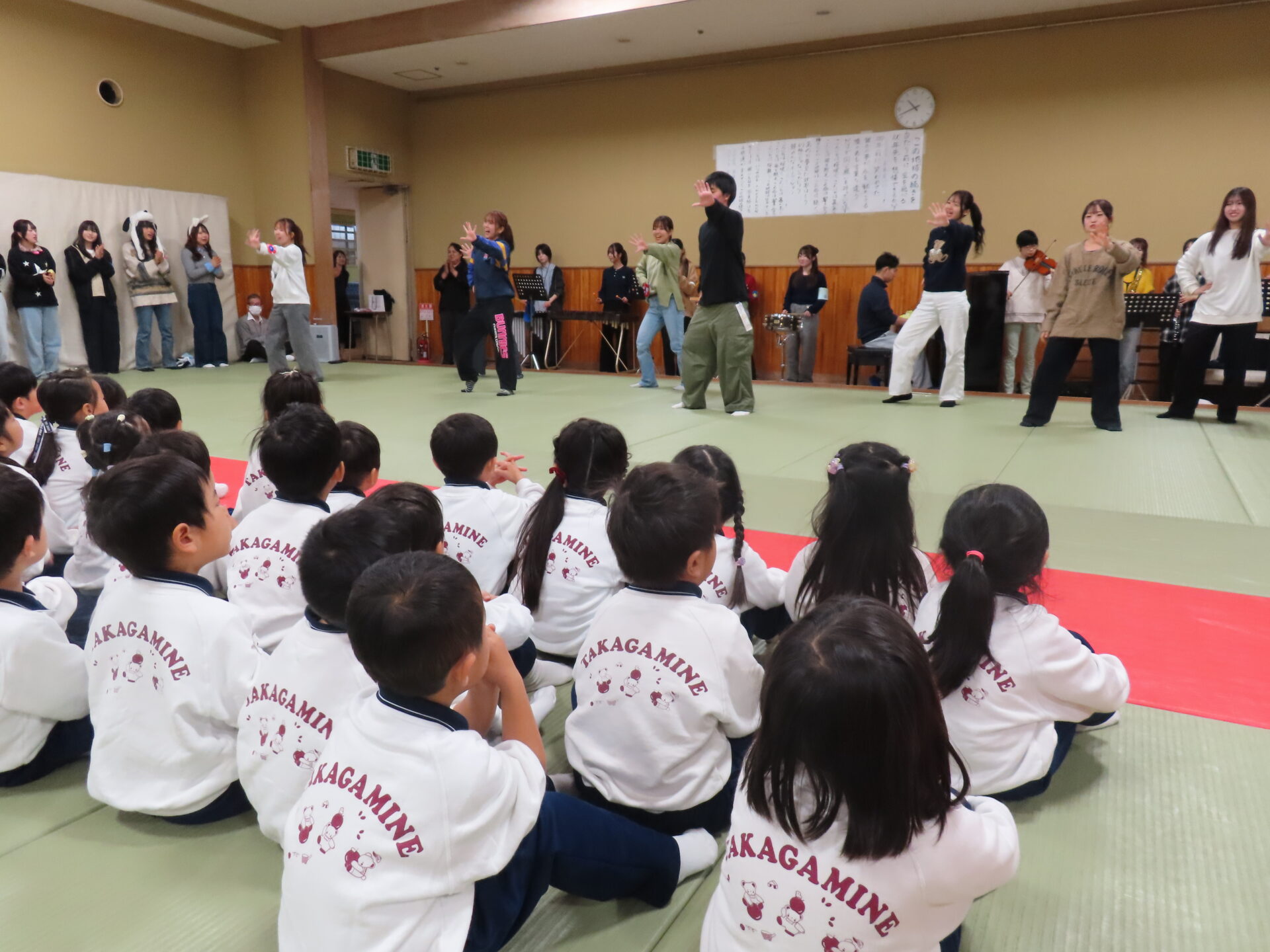 ゆり(年中)組・うめ(年長)組のお友だちが、佛教大学の学生さんに招待していただき、一緒に楽しいひとときを過ごしました。今回は『こども EXPO 2025』をテーマに、学生さんがさまざまな遊びを考えてくださいました。