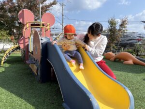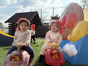 たんぽぽ1組(0歳児)のお友だちが、新園庭で遊びました。アンパンマンの車に乗ったり、お歌をうたいながらお花を観察したりとのびのびと体を動かしていました♪大好きな滑り台もたくさん楽しみ、元気いっぱい遊ぶ姿が見られました!