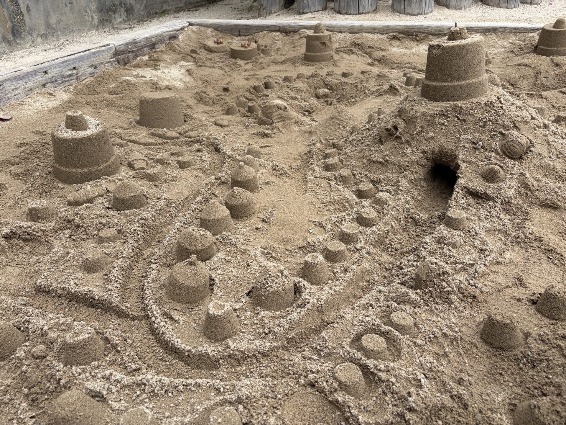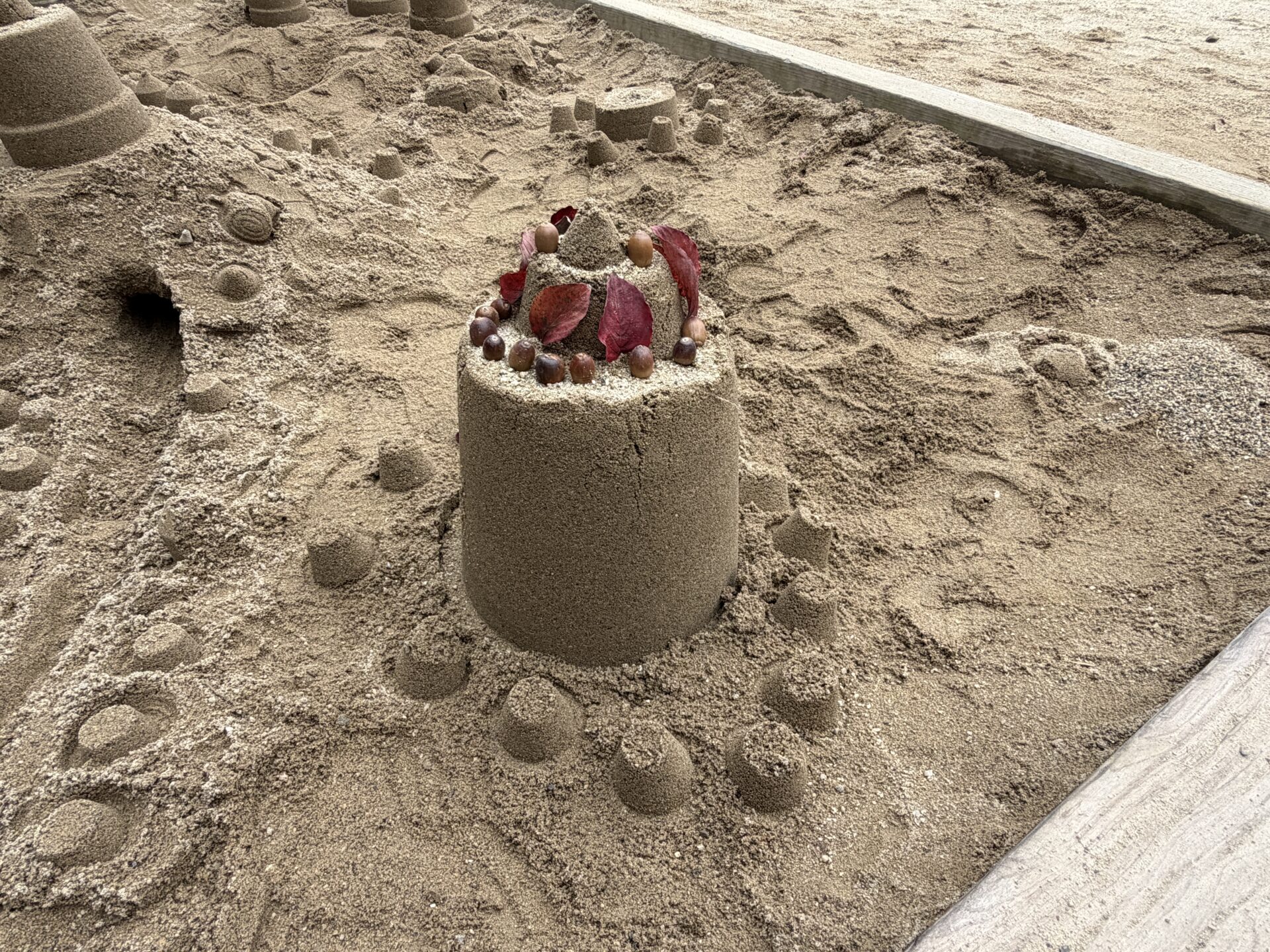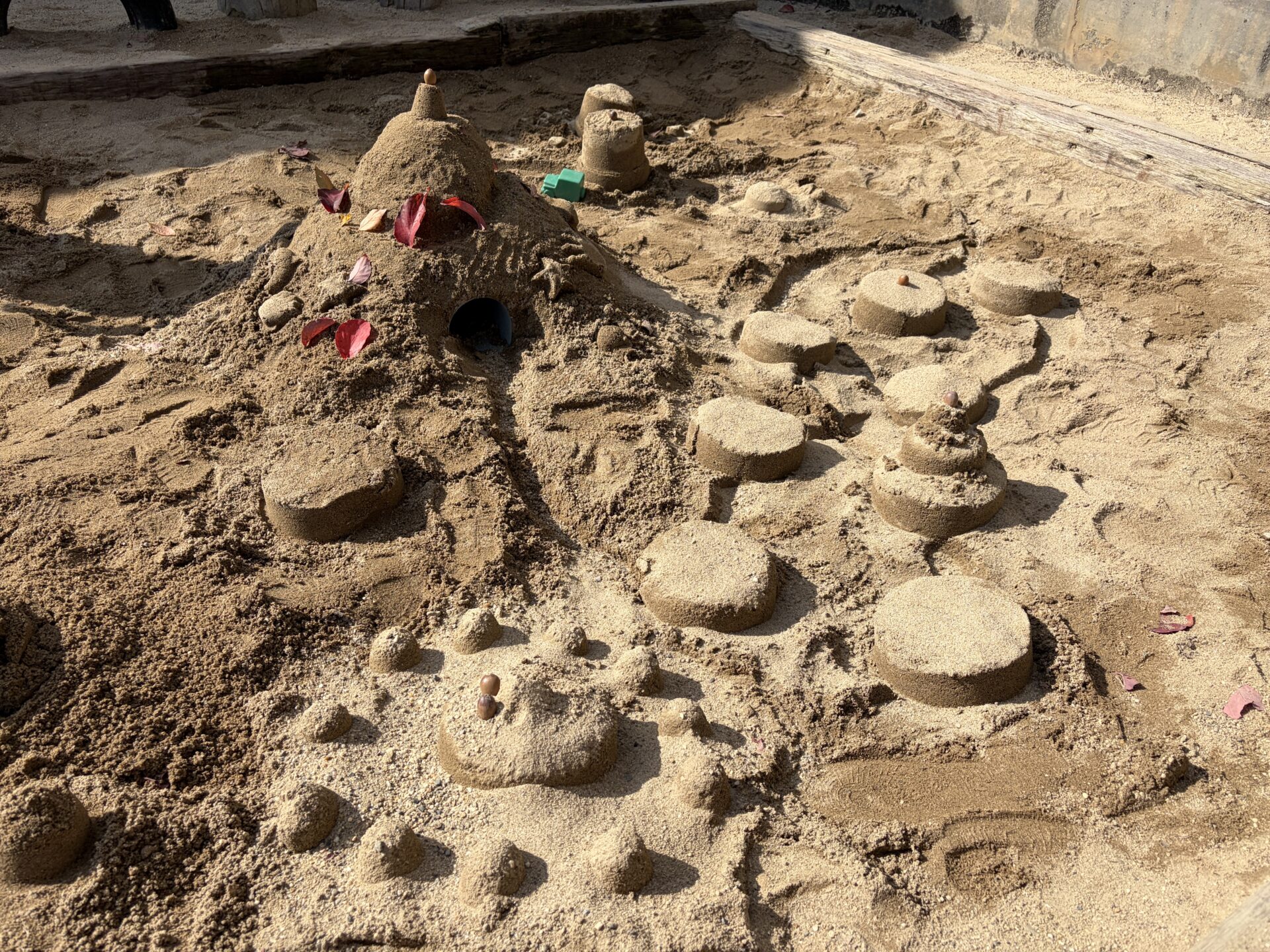 大きなお山を作った上に、砂を詰めたバケツをひっくり返し、少しずつお城を高くしていたみんな。「道にはざら粉(ふるいでふるった後の荒い砂)入れて砂利道にしよ~」「葉っぱで飾りをつけよう!」とお友だちと相談しながら力を合わせていました☆