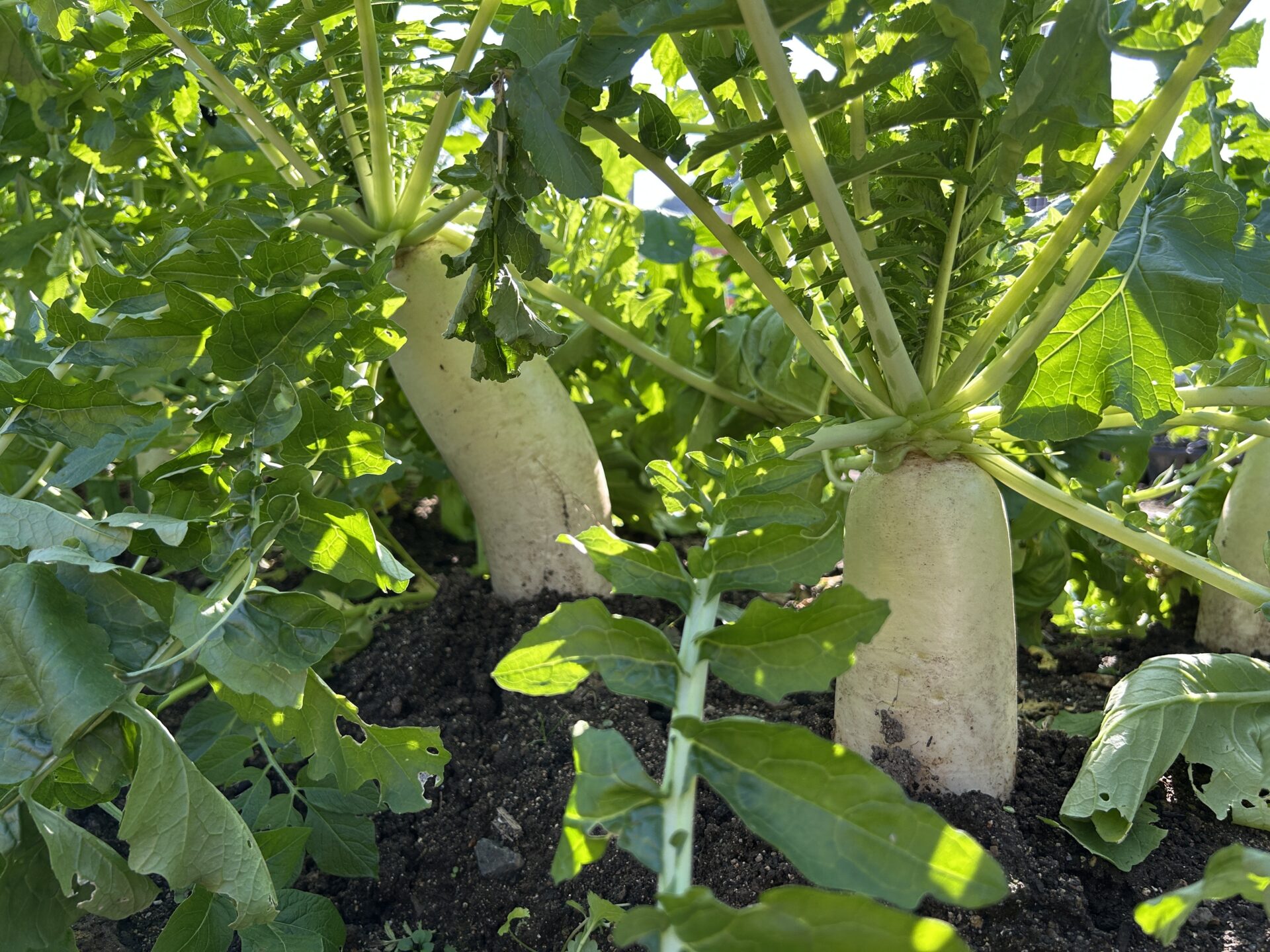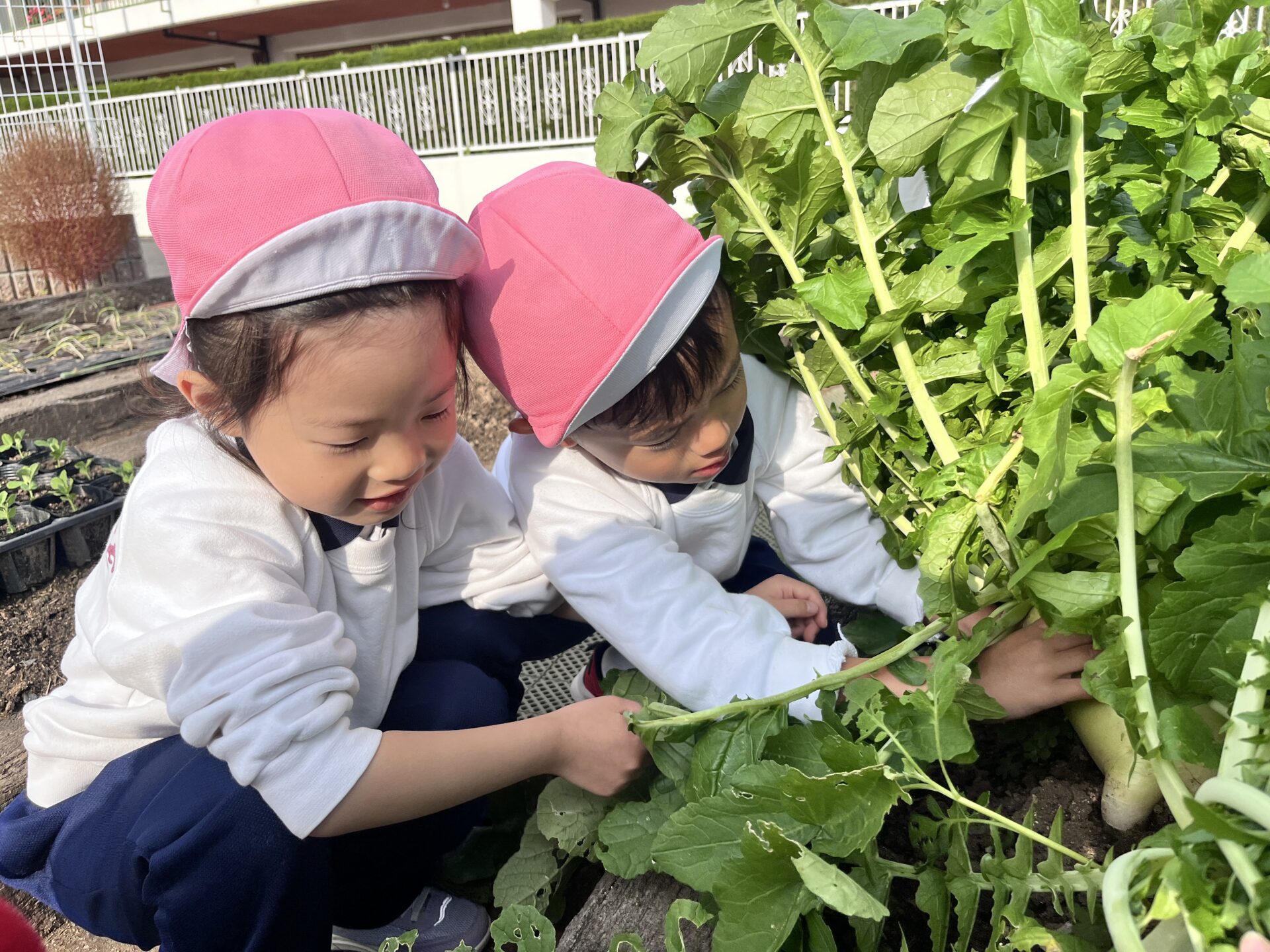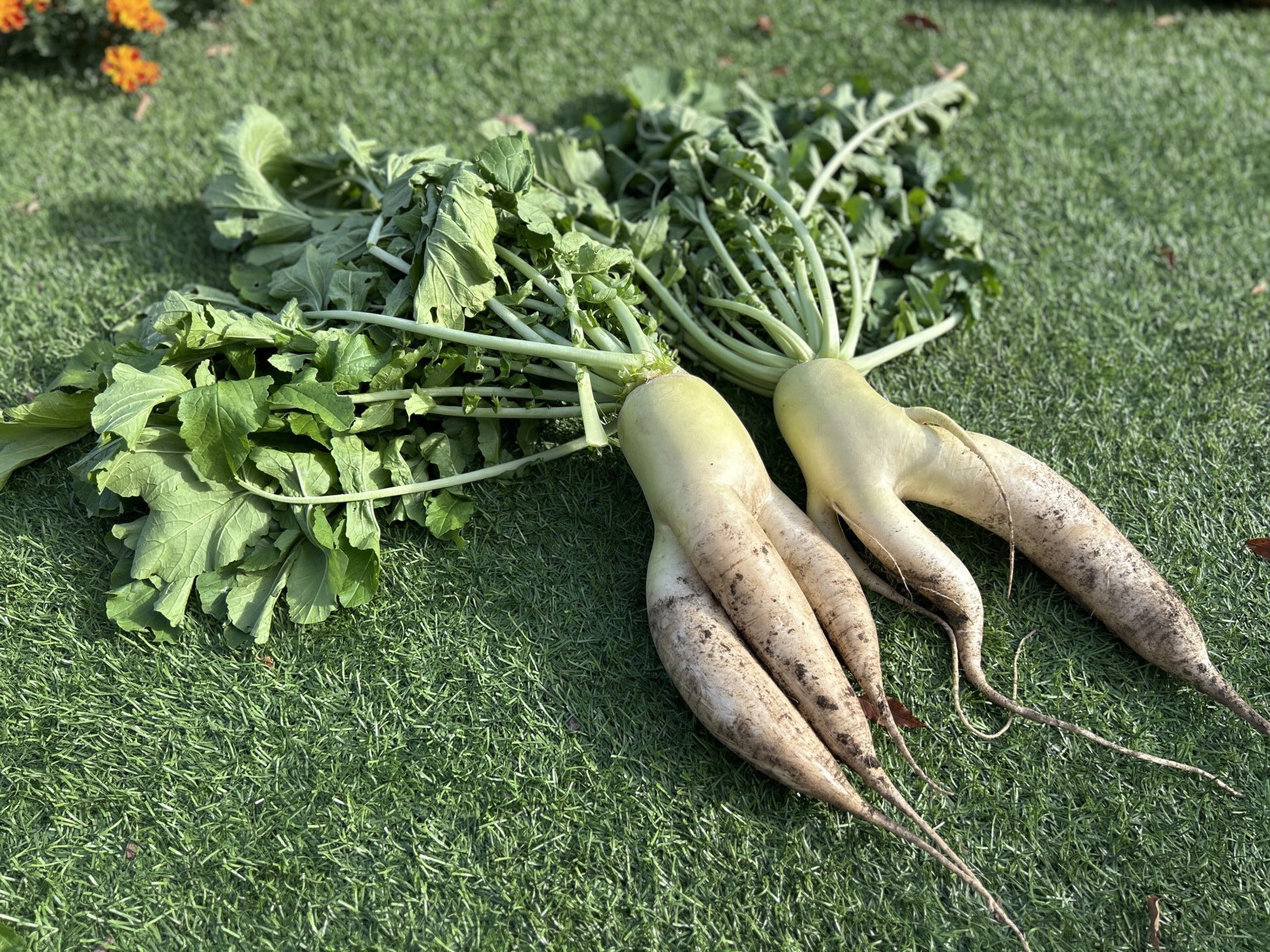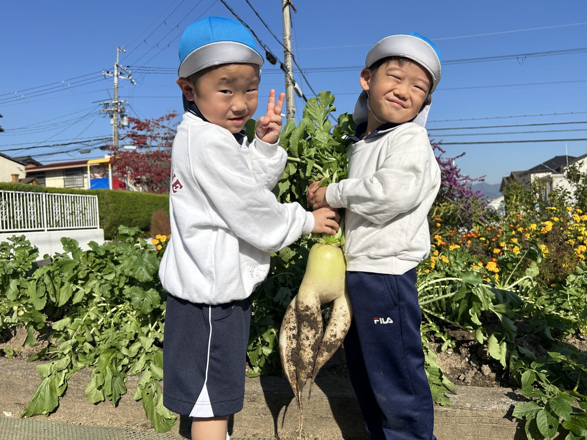 2025.11.17 園日記 大根の収穫をしたよ♪ ゆり(年中)組、うめ(年長)組のお友だちが、明日の収穫祭で使う大根を収穫しました。「この大根、踊ってるみたい♪」「めちゃくちゃ重たい…」と、いろいろな形や大きさを楽しんでいました♪ < 前へ 次へ > お知らせ・ブログ一覧へ