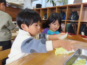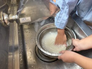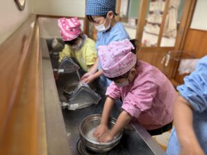 まずは、ゆり(年中)組・うめ(年長)組のお友だちが包丁で大根やにんじんを切り、さくら(年少)組のお友だちは白菜をちぎりました。さらに、うめ組のお友だちがお米を洗って準備完了!