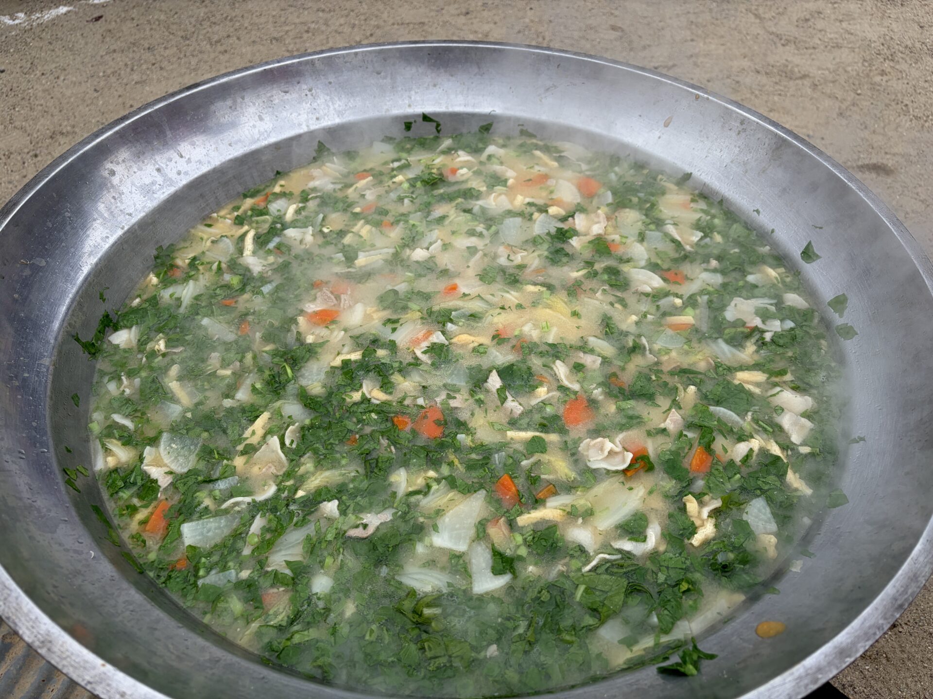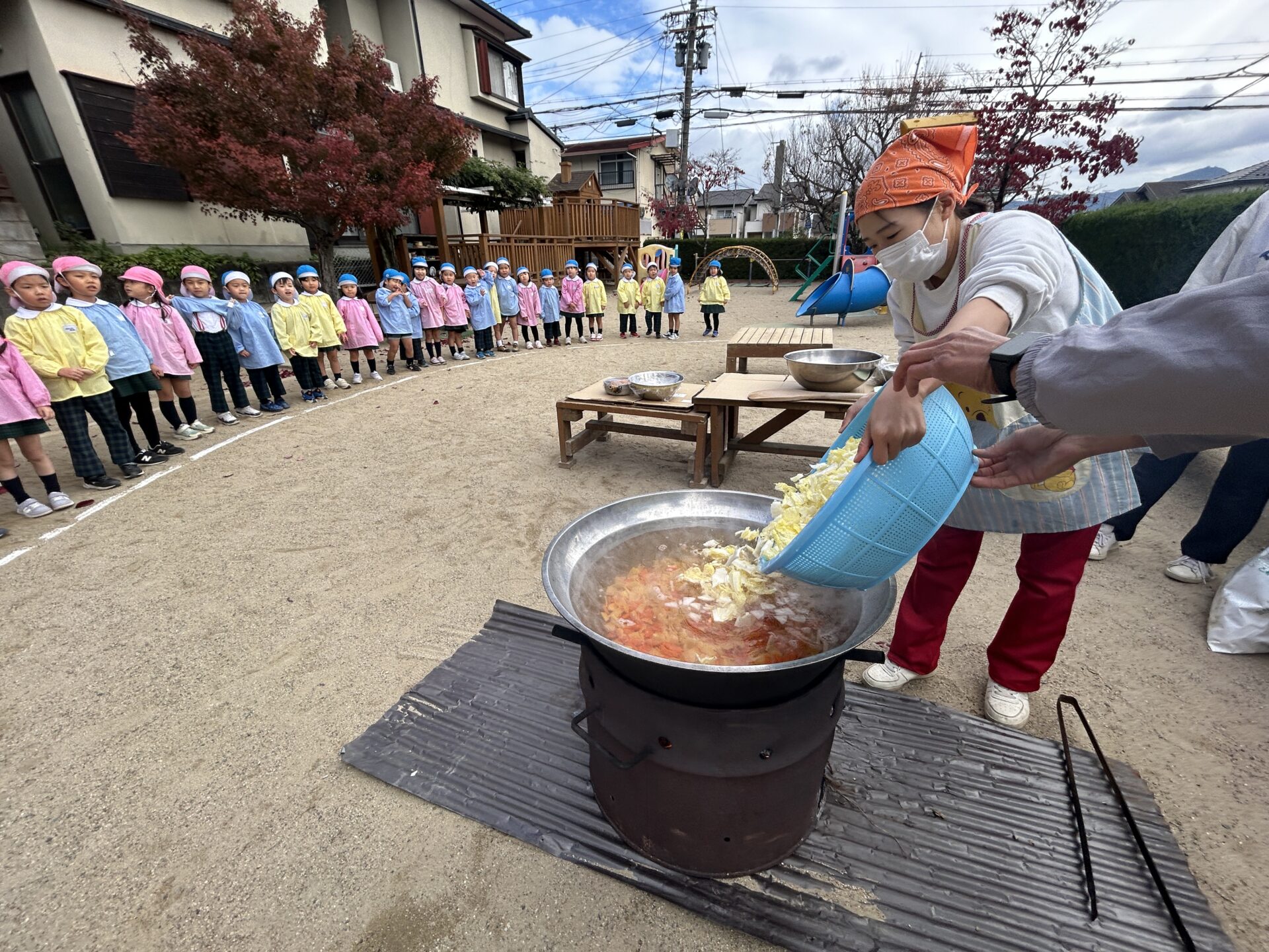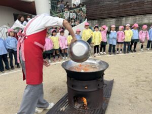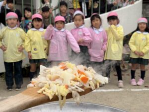 次に、切った野菜を園庭に持って行き、大きなお鍋にいれて豚汁作り♪ たんぽぽ組(0・1歳児)、ちゅうりっぷ組(2歳児)、さくら組のお友だちも見学に来てくれて、みんなで「おいしくなあれ♪」とおまじないをかけながら楽しく調理しました。