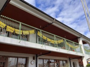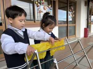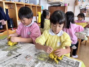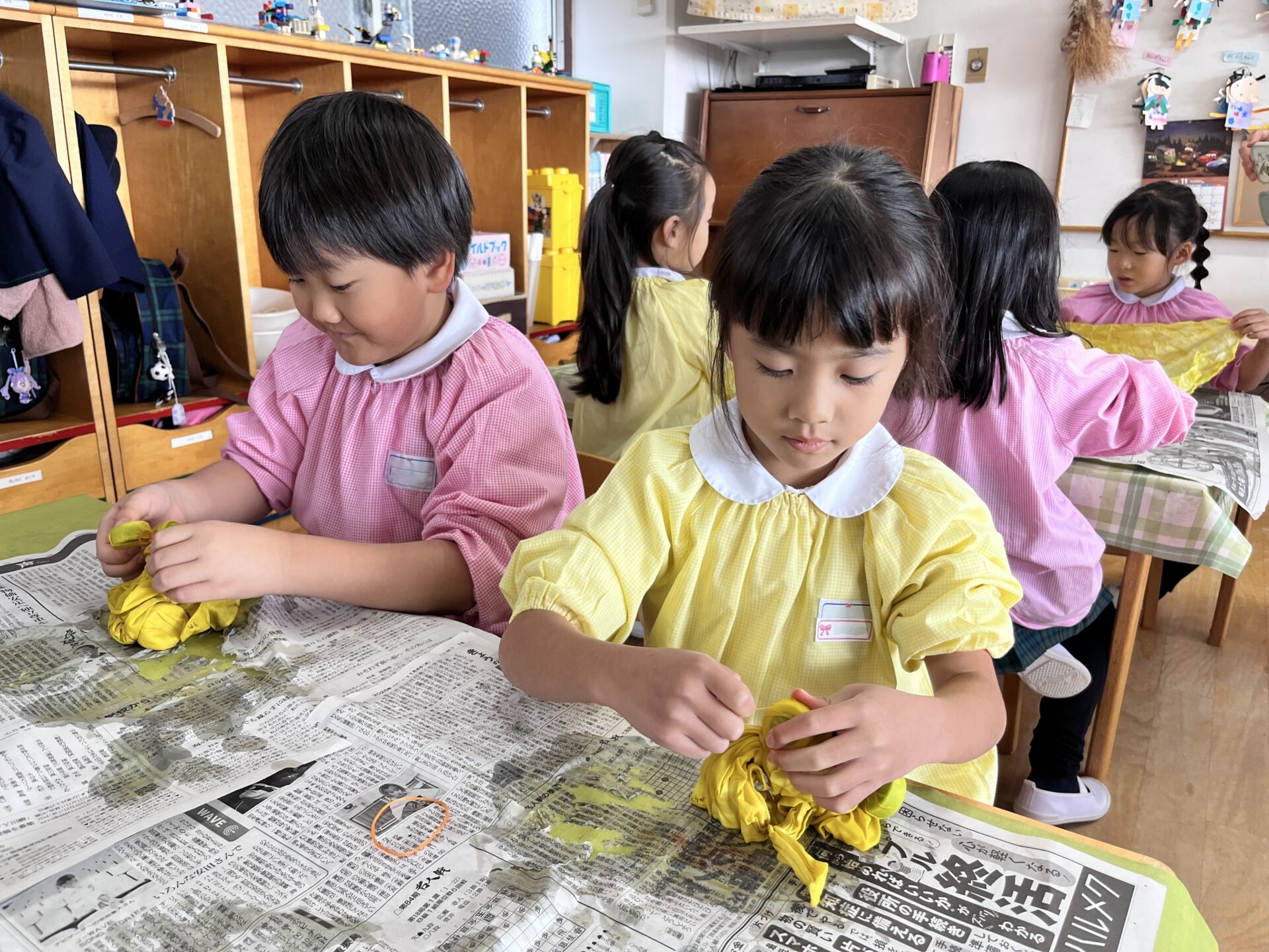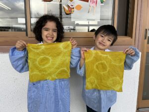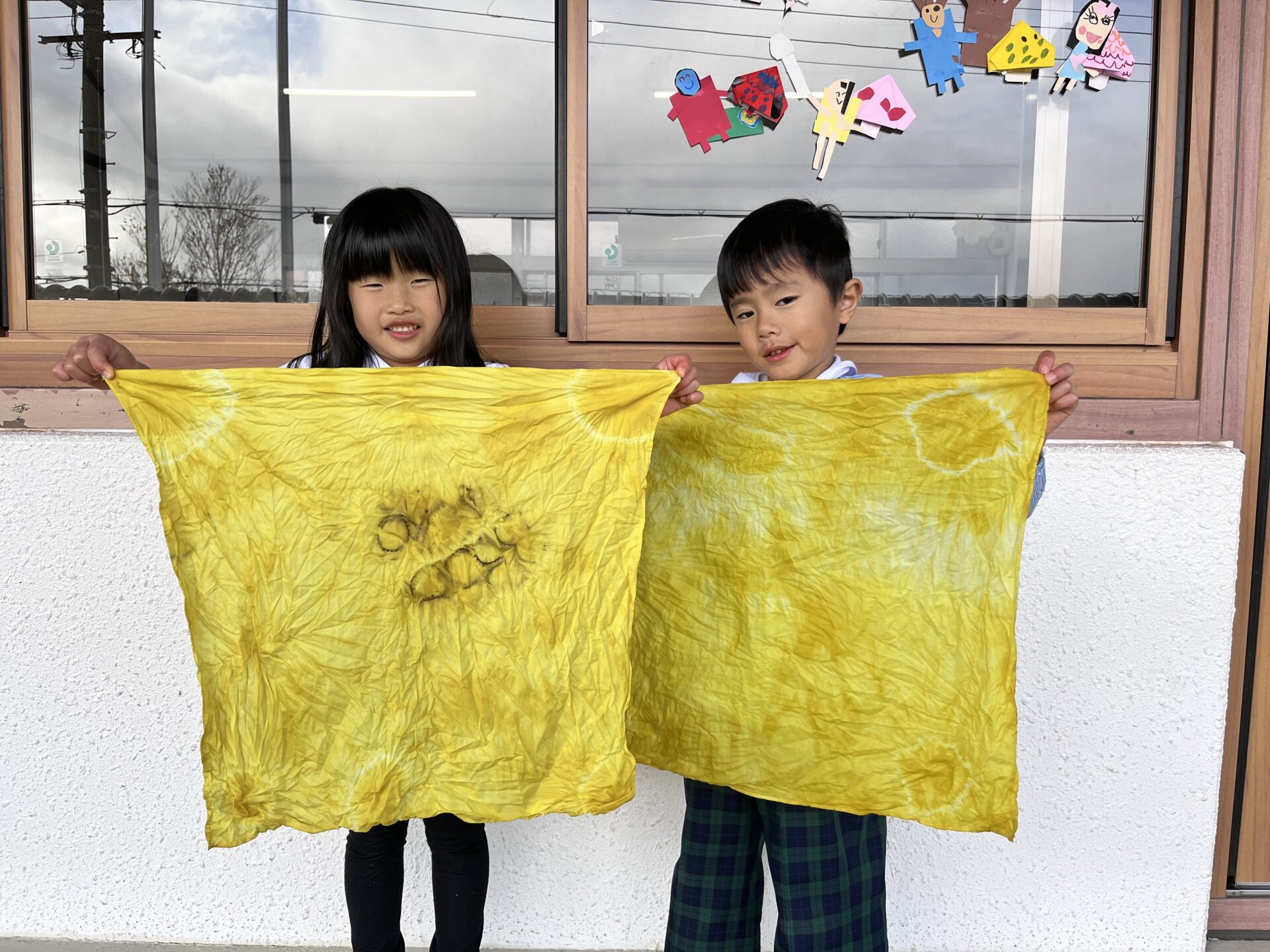 マリーゴールドの花を煮出して作った色水に一晩つけておいたハンカチやバンダナ。今日、ゆり(年中)組・うめ(年長)組のお友だちが、模様付けのために留めていた輪ゴムをそっと外してみると「丸い形になってる!」「水玉いっぱ~い♪」と大喜び。同じように染めても、にじみ方や模様は一人ひとり違っていて、布を広げるたびに「わぁ!」と歓声があがりました。世界に一つだけの特別な作品が完成し、嬉しそうな子どもたちでした☆