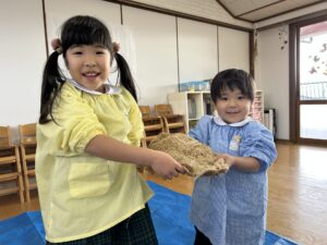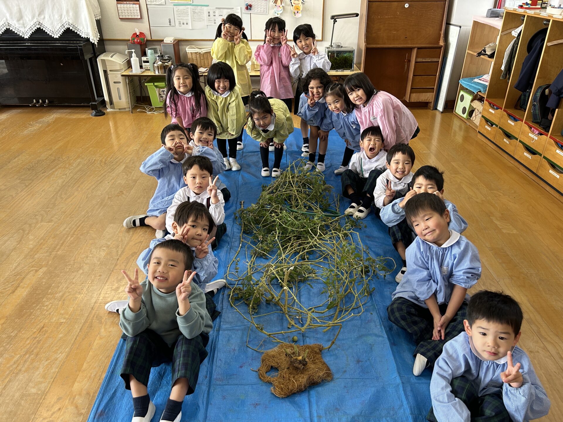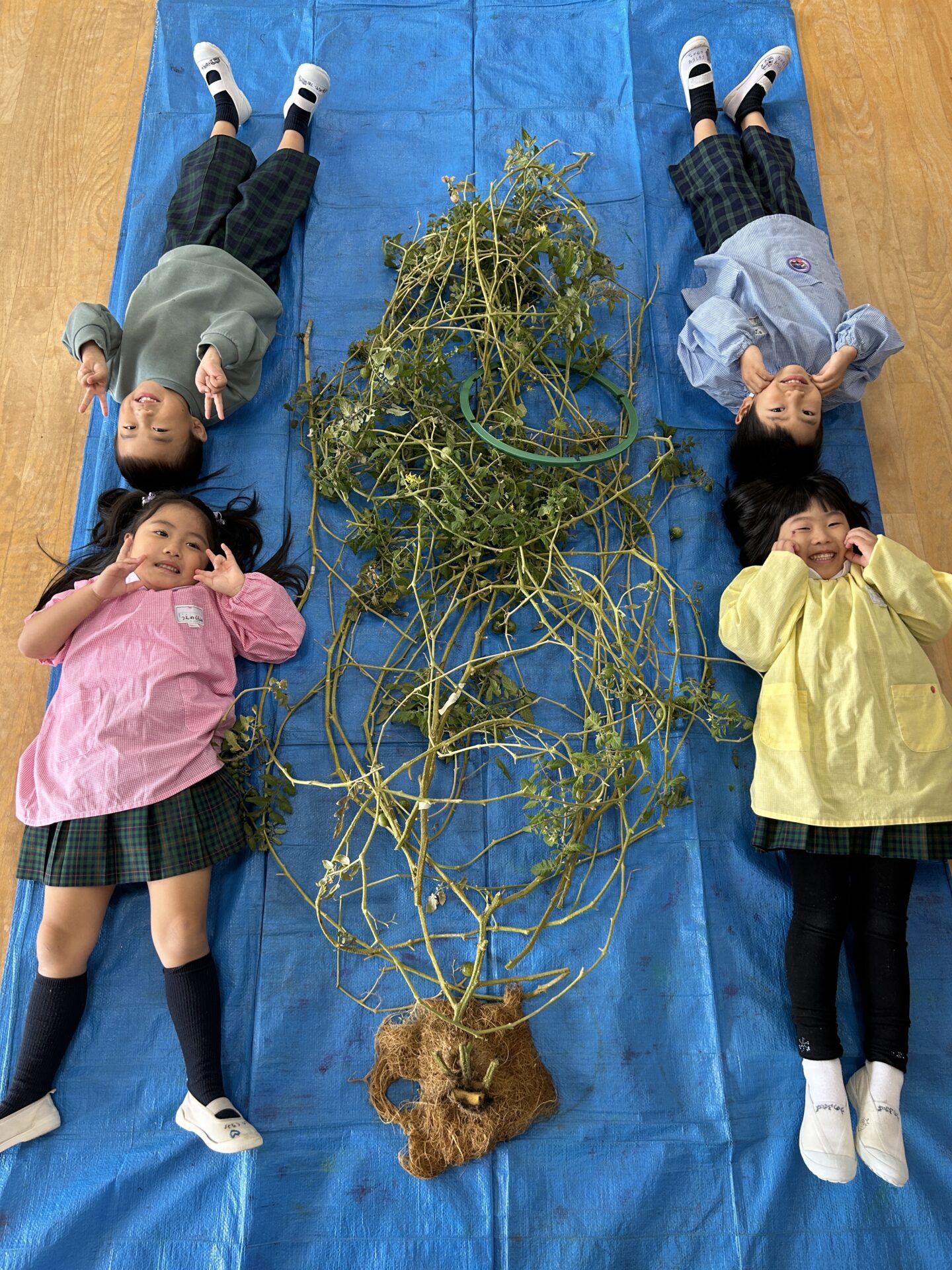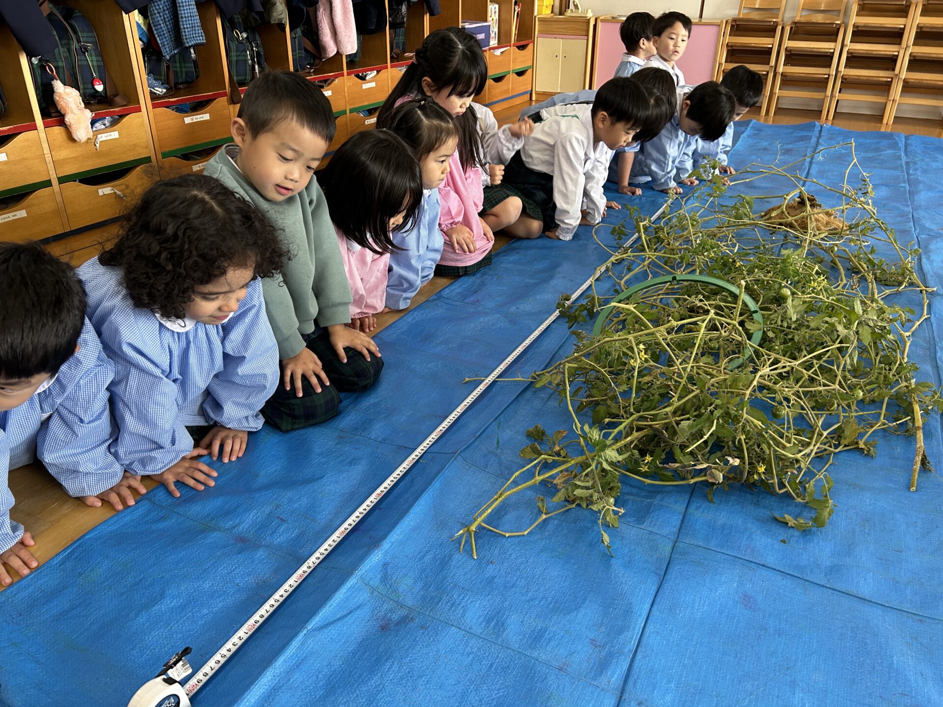 今日、最後のトマトを収穫し、栽培容器からそっと取り出して背比べをしてみると、「え~!2人分ある!」「なが~い!」とびっくり!さらに根っこ見て「もじゃもじゃしてる~!」と、最後までわくわくの観察が続きました。