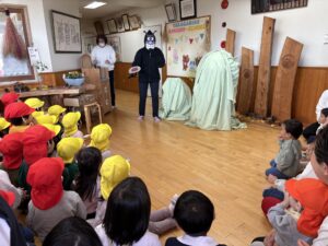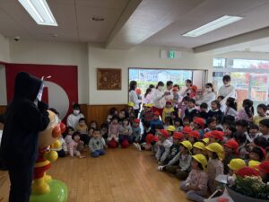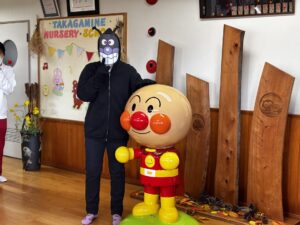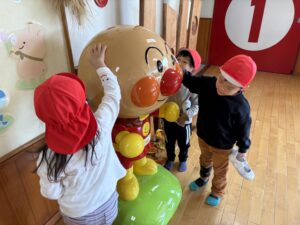 最後に、ばいきんまんが「みんなを守るために、たかがみねこども園に来たよ。毎日ここで待っているから、元気に登園してね!」とアンパンマンの言葉を代弁して伝えると、子どもたちは嬉しそうに「はーい!」と元気にお返事していました。