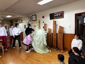 「はひふへほ~! アンパンマンを探してるんだけど、どこにいるか知ってる?」と問いかけると、子どもたちは布に包まれた物を指さして、「ここ!」「絶対ここにいる!」と大盛り上がりです。