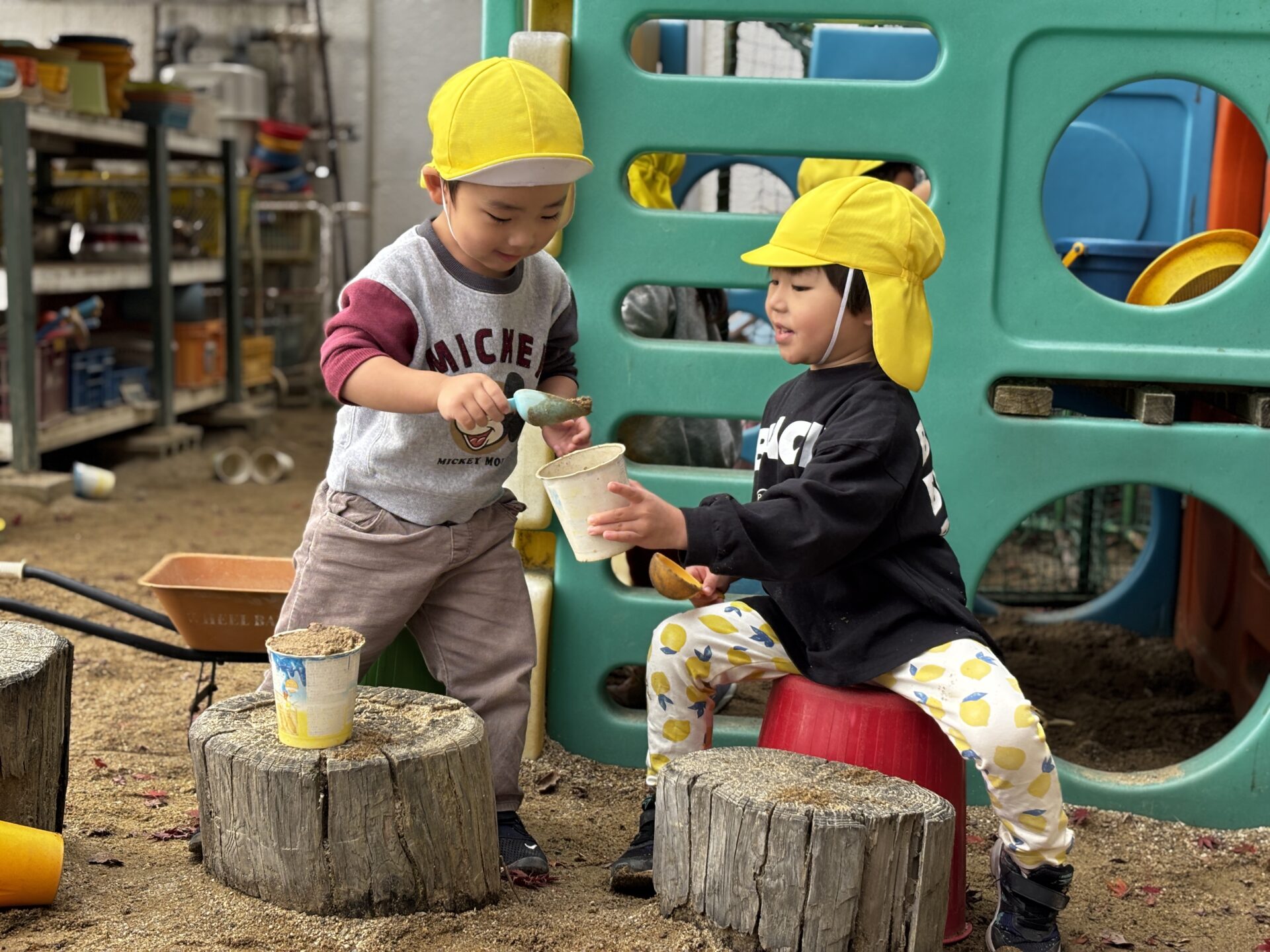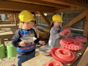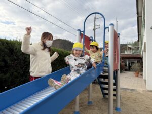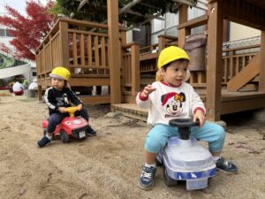 ちゅうりっぷ組(2歳児)のお友だちが、園庭で遊びました。滑り台の上から「やっほー!」と手を振りお友だちと一緒にすべったり、車のおもちゃに乗ってドライブを楽しんでいました。砂場でごはんを作って「いただきます!」とおままごとをして遊んでいるお友だちもいましたよ☆