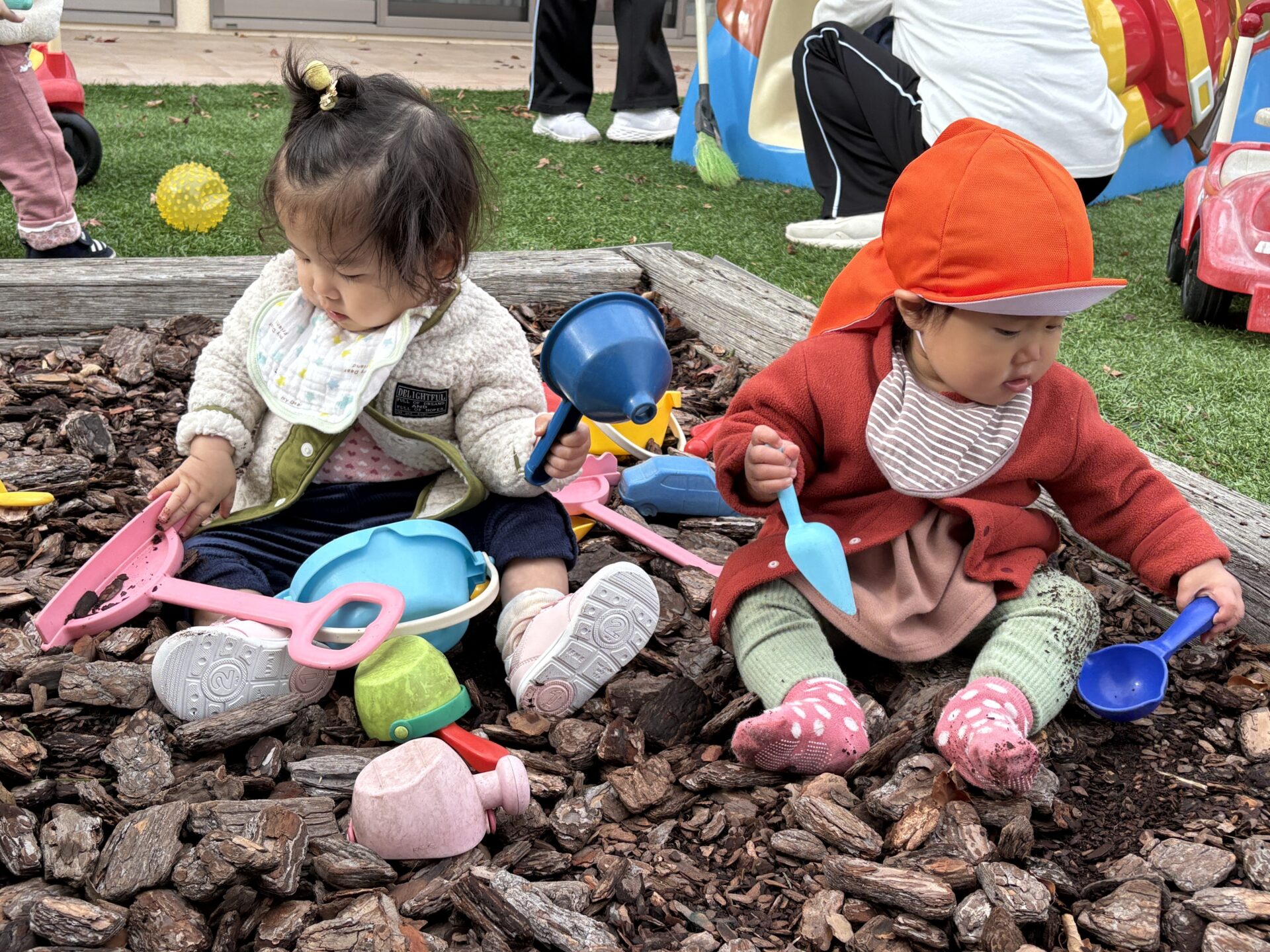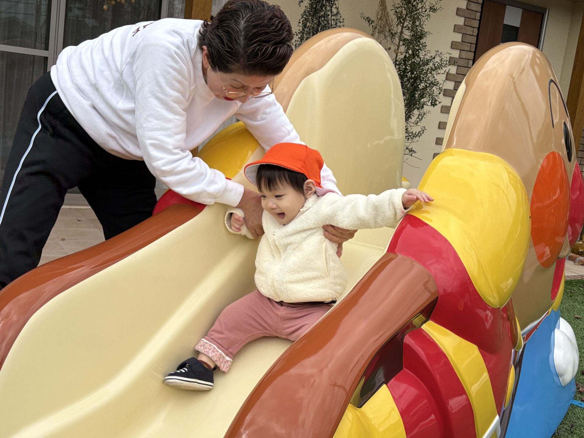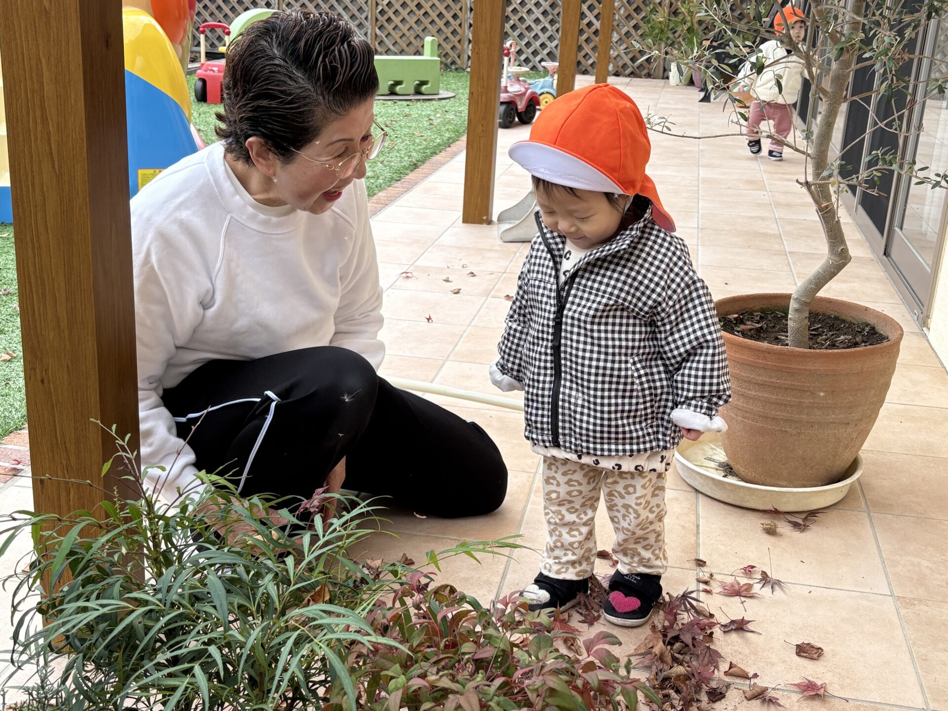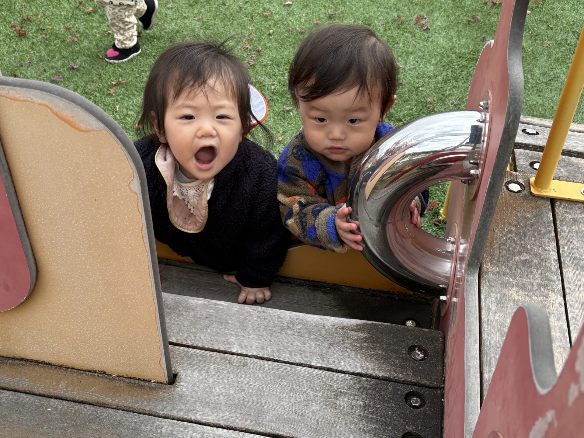 たんぽぽ1組(0歳児)のお友だちが、新園庭で遊びました。たくさんの落ち葉を集めると感触を楽しんだり、遊具から「ばぁ!」とかわいく顔をのぞかせたりと元気いっぱい☆また、お友だちと並んでウッドチップで遊んだり、ニコニコ笑顔で滑り台をすべったりしてのびのびと過ごしました。