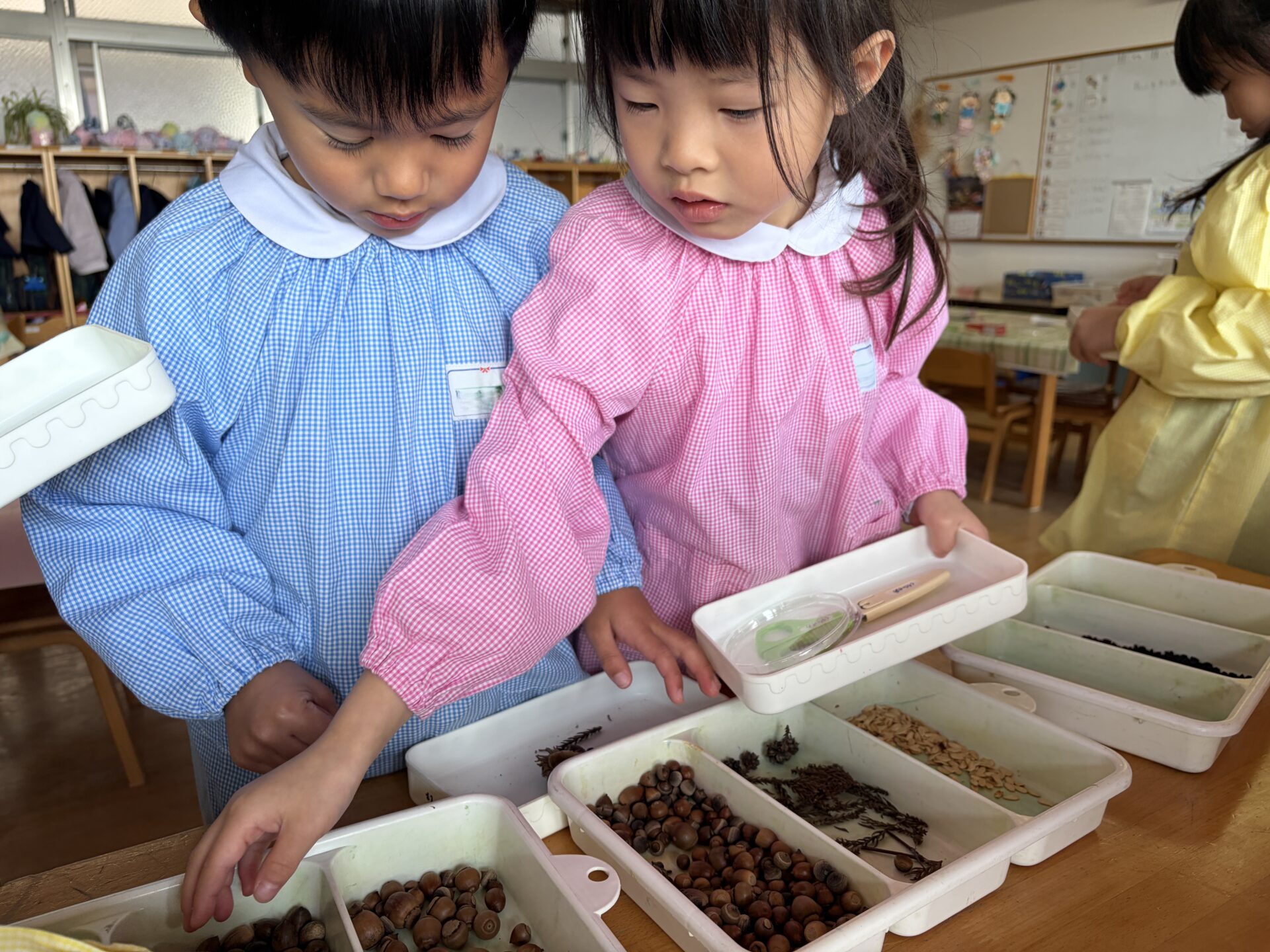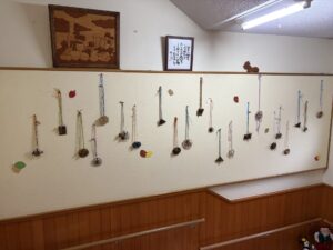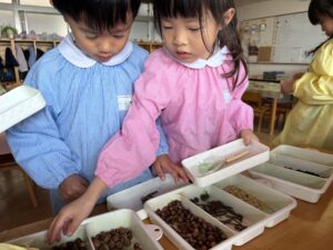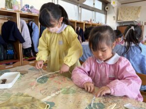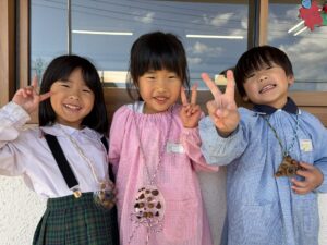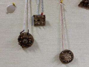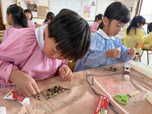うめ(年長)組のお友だちが、お散歩で拾っていたどんぐりや枝などを使ってペンダントを作りました。ダンボールやプラカップの蓋をベースにし、さまざまな自然物を貼り付けていた子どもたち。首にかける紐は、自分で選んだ色の毛糸を使って三つ編みにも挑戦しました。「難しいな…」と苦戦しながらも、真剣な表情だったみんな。たった一つの素敵なペンダントが完成しました。階段に飾ってありますので、ぜひご覧ください☆