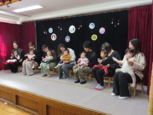 『♪おもちゃのチャチャチャ♪』は、大好きなお母さまと一緒に手作りのマラカスをシャカシャカ振りながら、可愛らしい笑顔を見せてくれました。なかにはいつもと違う雰囲気に泣いてしまったり緊張した表情のお友だちもいましたが、元気いっぱいマラカスを振って発表してくれました♪