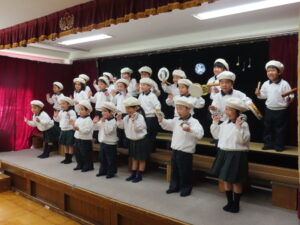 4月からリズム遊びを通してさまざまな楽器に触れ、コツコツと練習を重ねてきた子どもたち。リズムを合わせることに難しさを感じながらも「みんなで心をひとつに音を合わせよう」という思いで取り組んできました。発表会当日は少し緊張しながらも、これまでの練習を思い出して『♪アメリカンパトロール♪』を一生懸命演奏する姿が見られ、客席からのたくさんの拍手は大きな自信につながったことと思います。