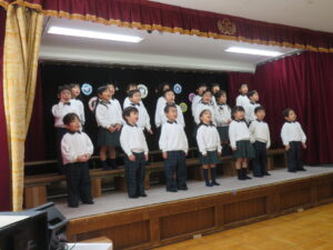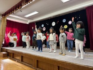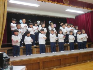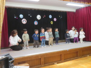 『♪だいすきがいっぱい♪』は、普段の遊びの中でも口ずさむほどのお気に入りの曲。本番でも笑顔いっぱいでうたうことができました♪そして『♪にじ♪』は「温かい気持ちでうたおうね」とお話しながら練習を重ねてきました。本番では強弱をつけながら、優しい声で気持ちを込めてうたう姿がとても印象的でした。