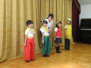 『♪チャギントンのテーマソング♪』では、曲が始まると笑顔になり、電車になりきって踊る姿がとても可愛かったですね。「レッツ ライド!」のフレーズではかっこいいポーズも見せてくれました☆『♪クリスマスの歌がきこえてくるよ♪』では、うさぎさんの“ピョンピョン”やくまさんの“ドッシンドッシン”を楽しそうに体いっぱいで表現してくれたり、元気いっぱいの歌声を披露してくれました☆緊張しながらも、舞台の上で思い切り楽しむ子どもたちの笑顔がとっても素敵でした♪