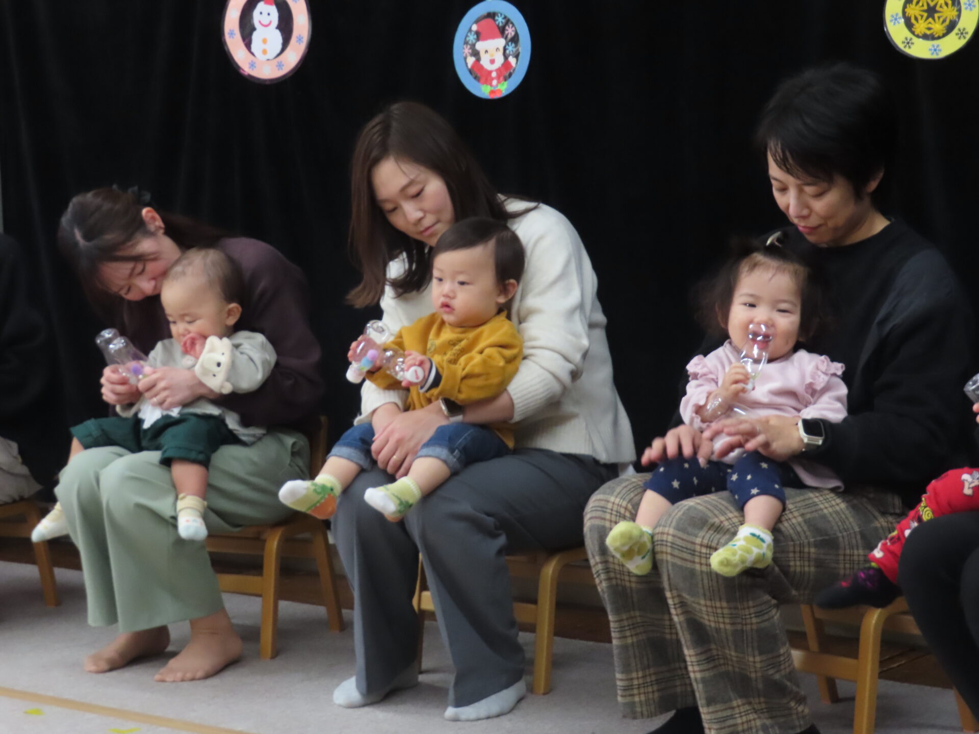 『♪おもちゃのチャチャチャ♪』は、大好きなお母さまと一緒に手作りのマラカスをシャカシャカ振りながら、可愛らしい笑顔を見せてくれました。なかにはいつもと違う雰囲気に泣いてしまったり緊張した表情のお友だちもいましたが、元気いっぱいマラカスを振って発表してくれました♪