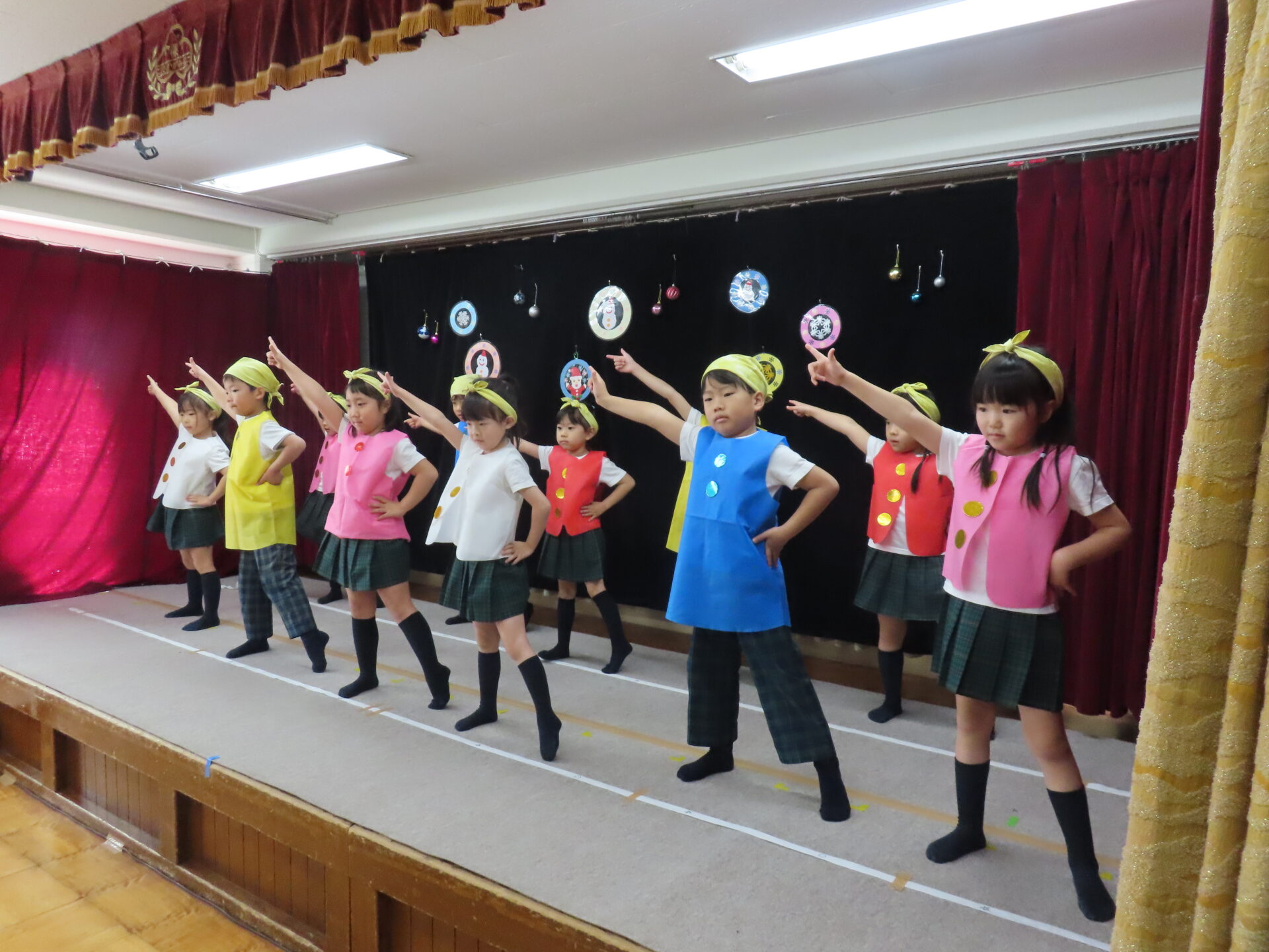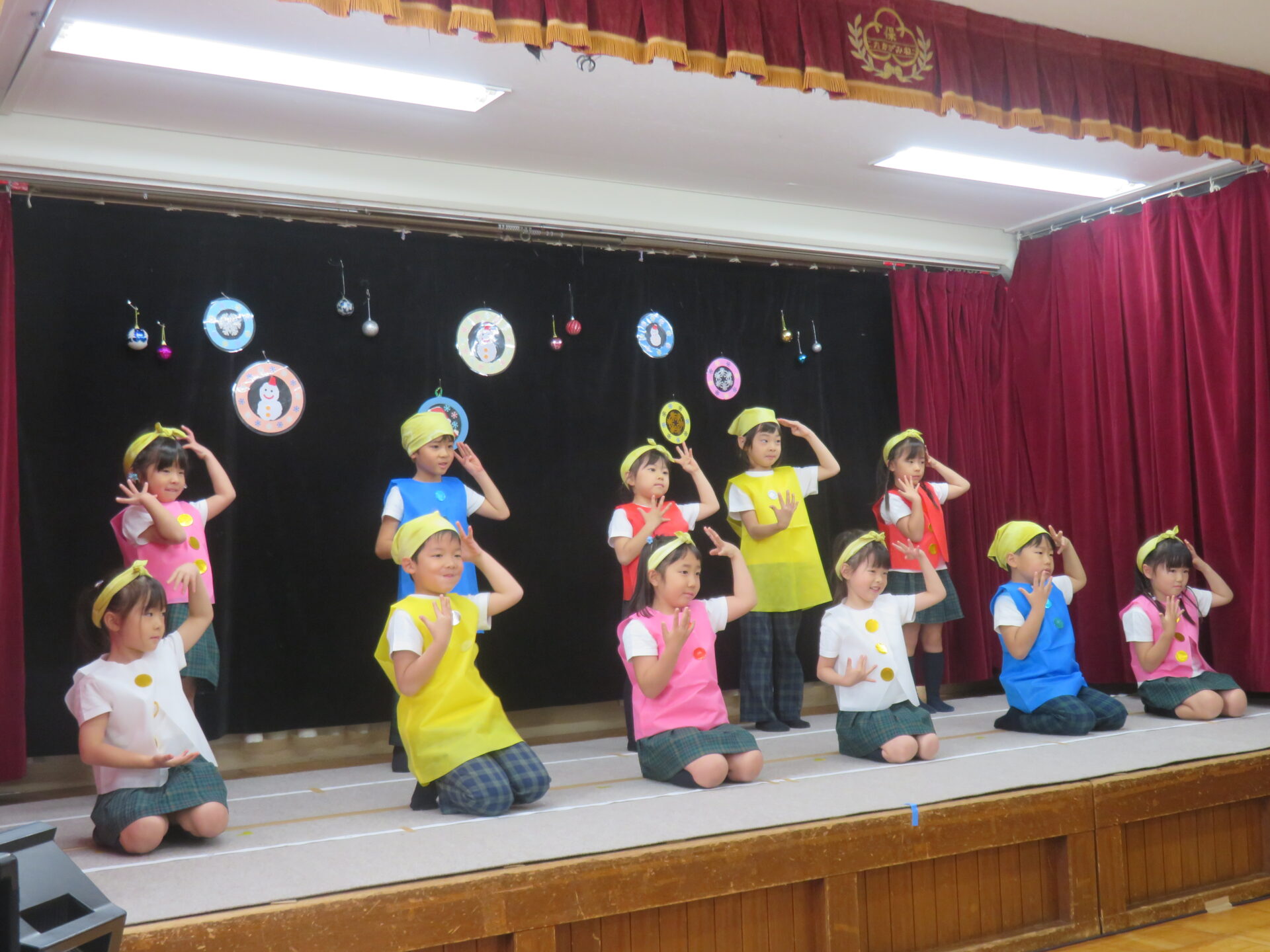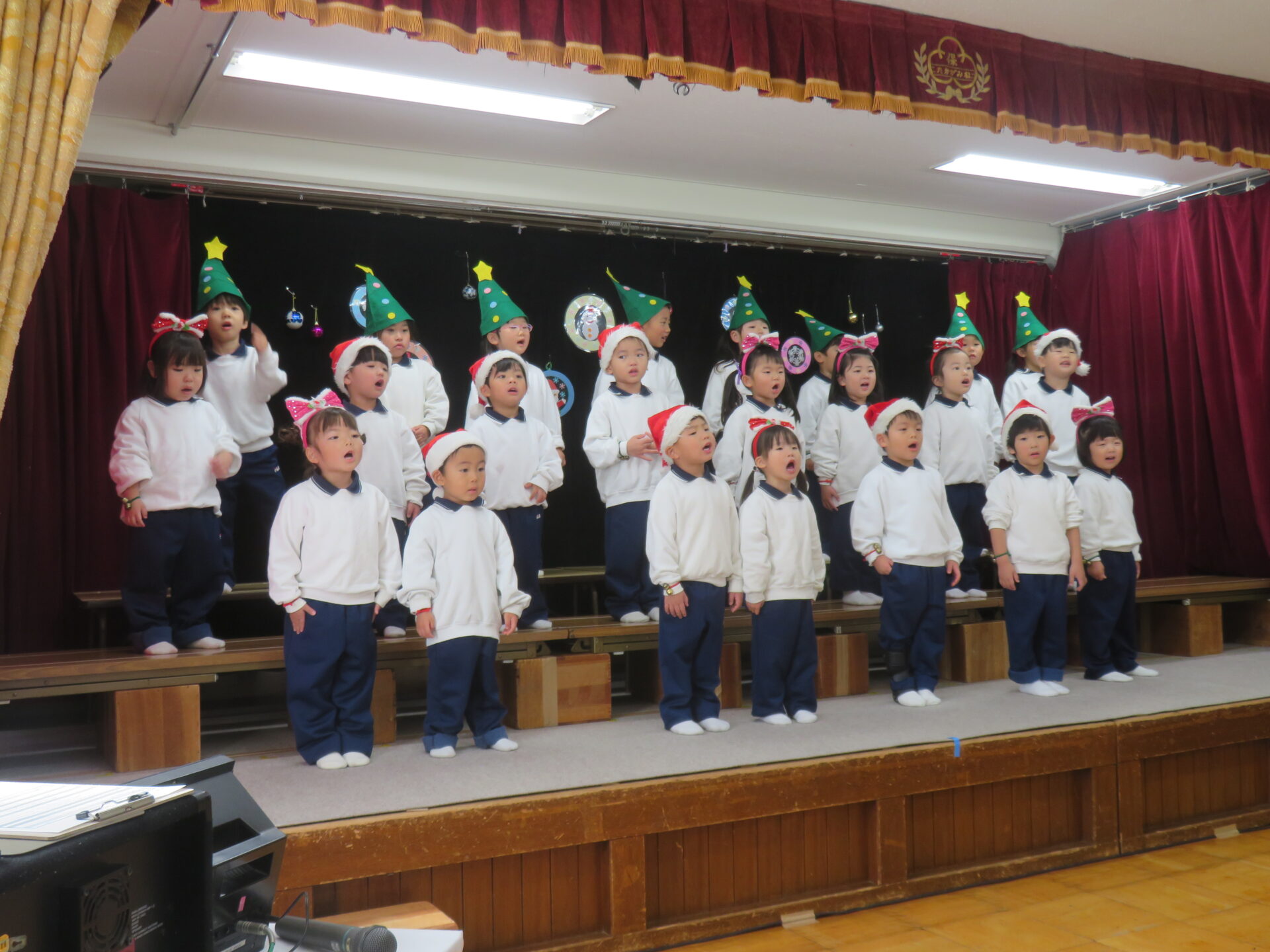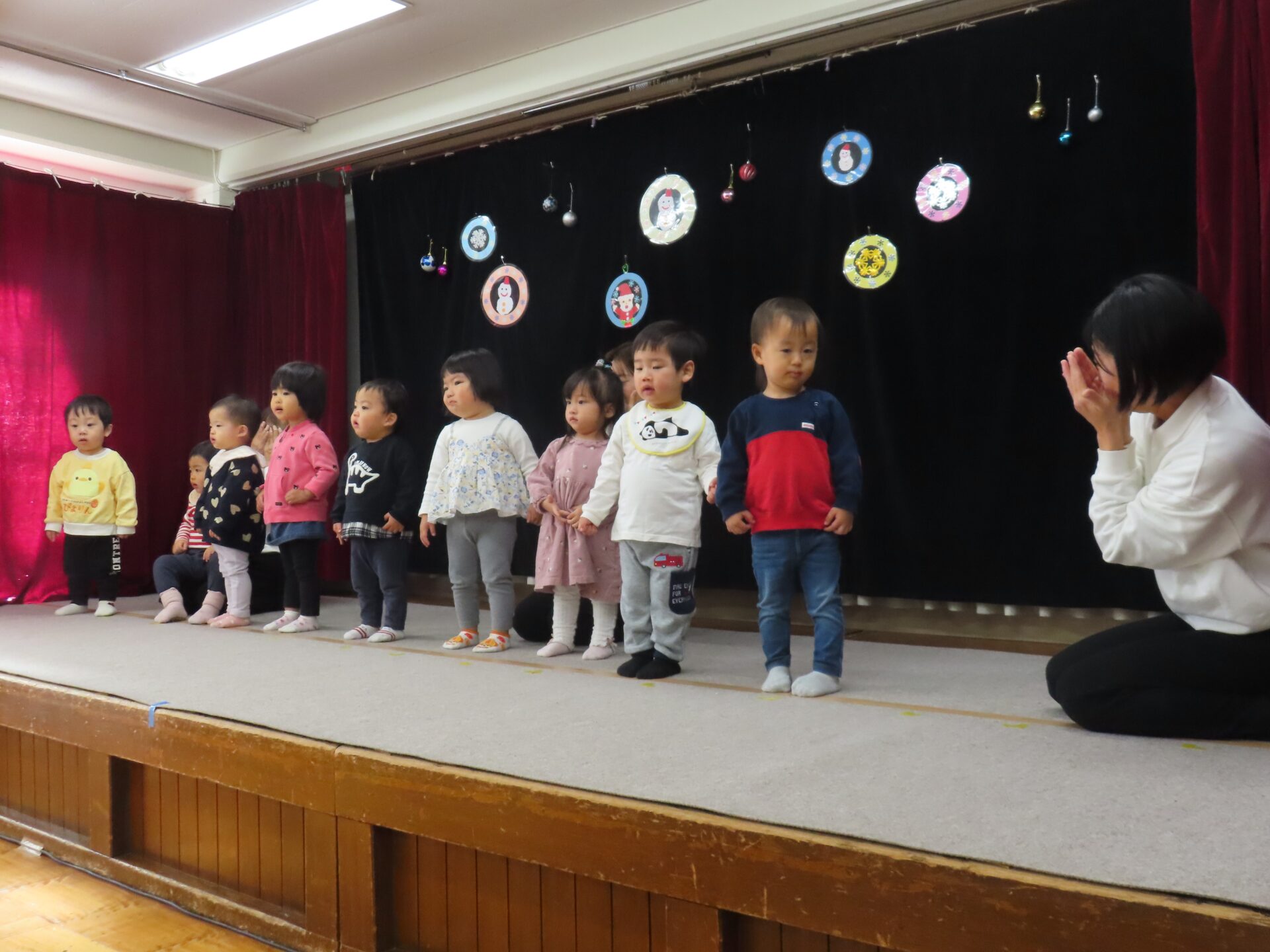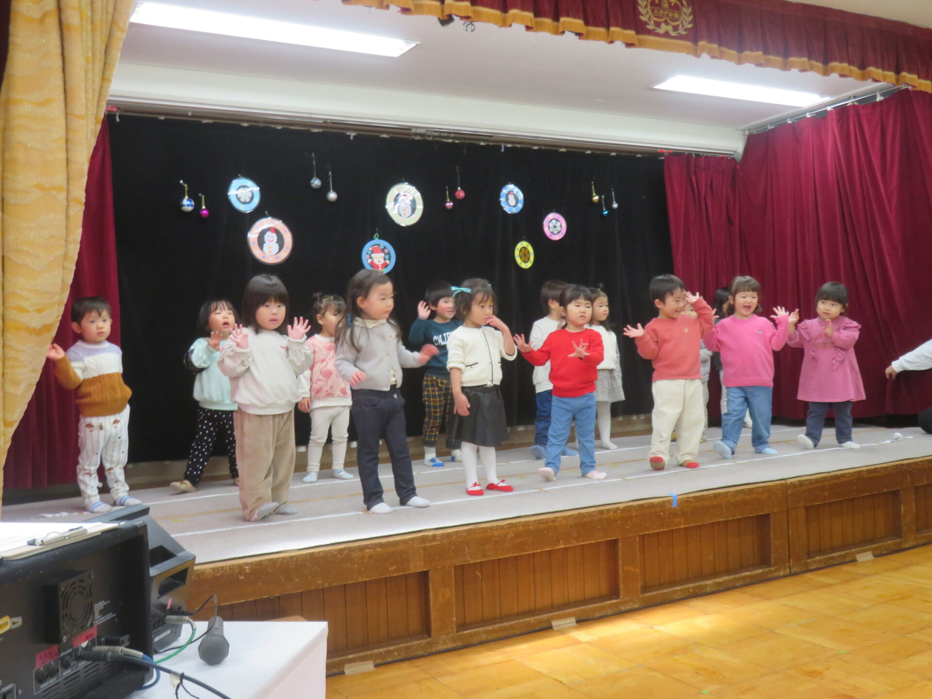 『♪チャギントンのテーマソング♪』では、曲が始まると笑顔になり、電車になりきって踊る姿がとても可愛かったですね。「レッツ ライド!」のフレーズではかっこいいポーズも見せてくれました☆『♪クリスマスの歌がきこえてくるよ♪』では、うさぎさんの“ピョンピョン”やくまさんの“ドッシンドッシン”を楽しそうに体いっぱいで表現してくれたり、元気いっぱいの歌声を披露してくれました☆緊張しながらも、舞台の上で思い切り楽しむ子どもたちの笑顔がとっても素敵でした♪