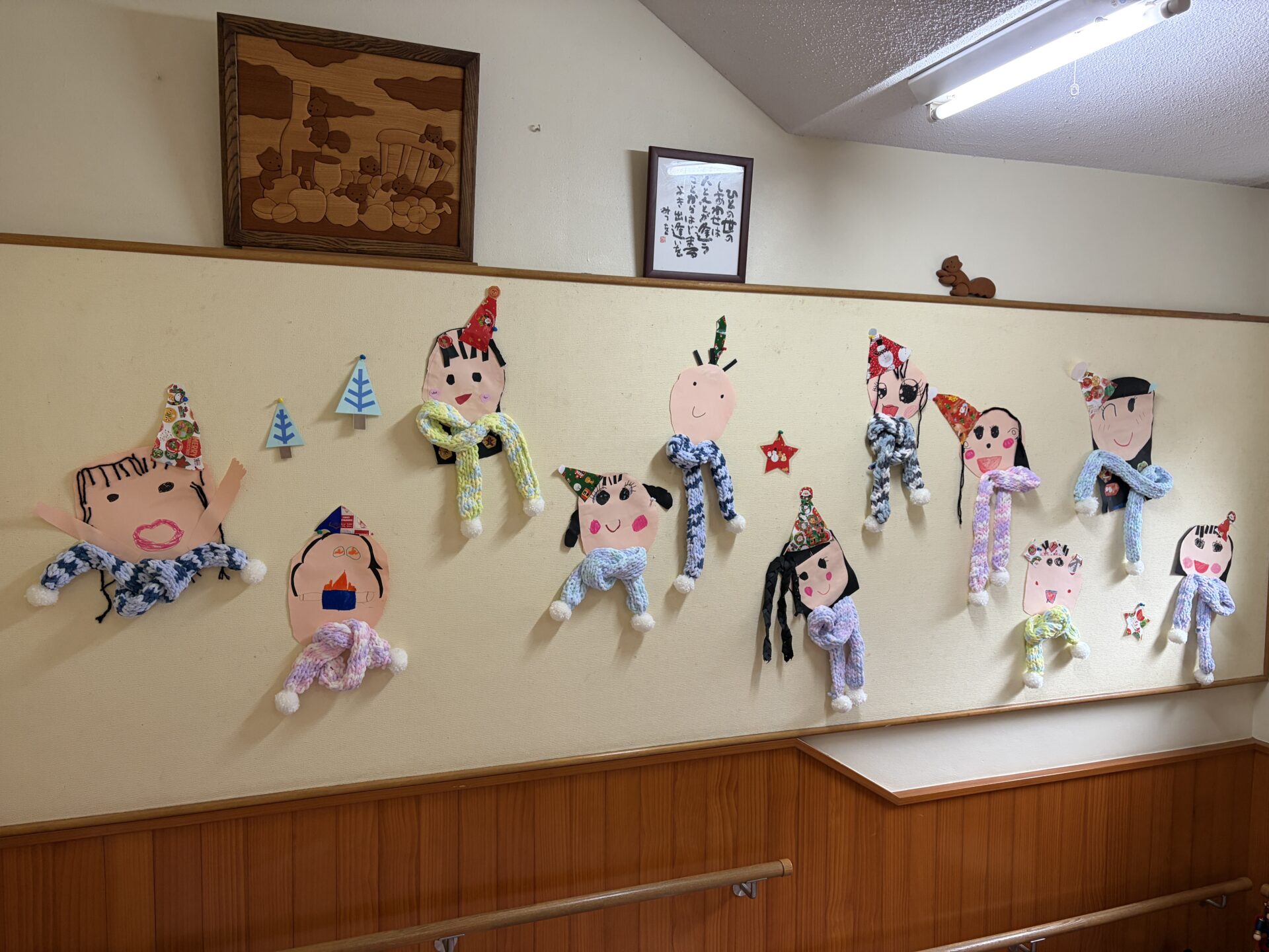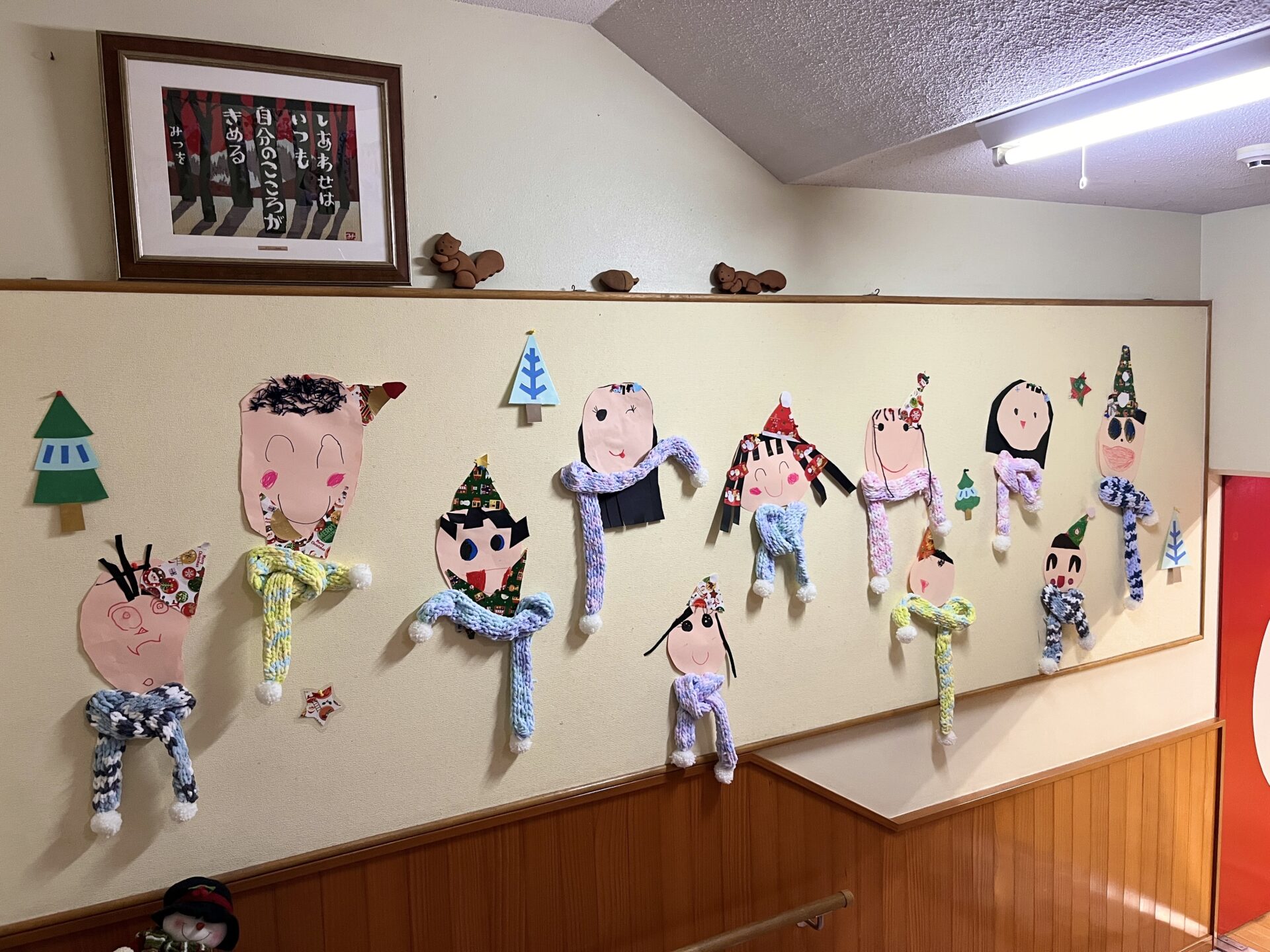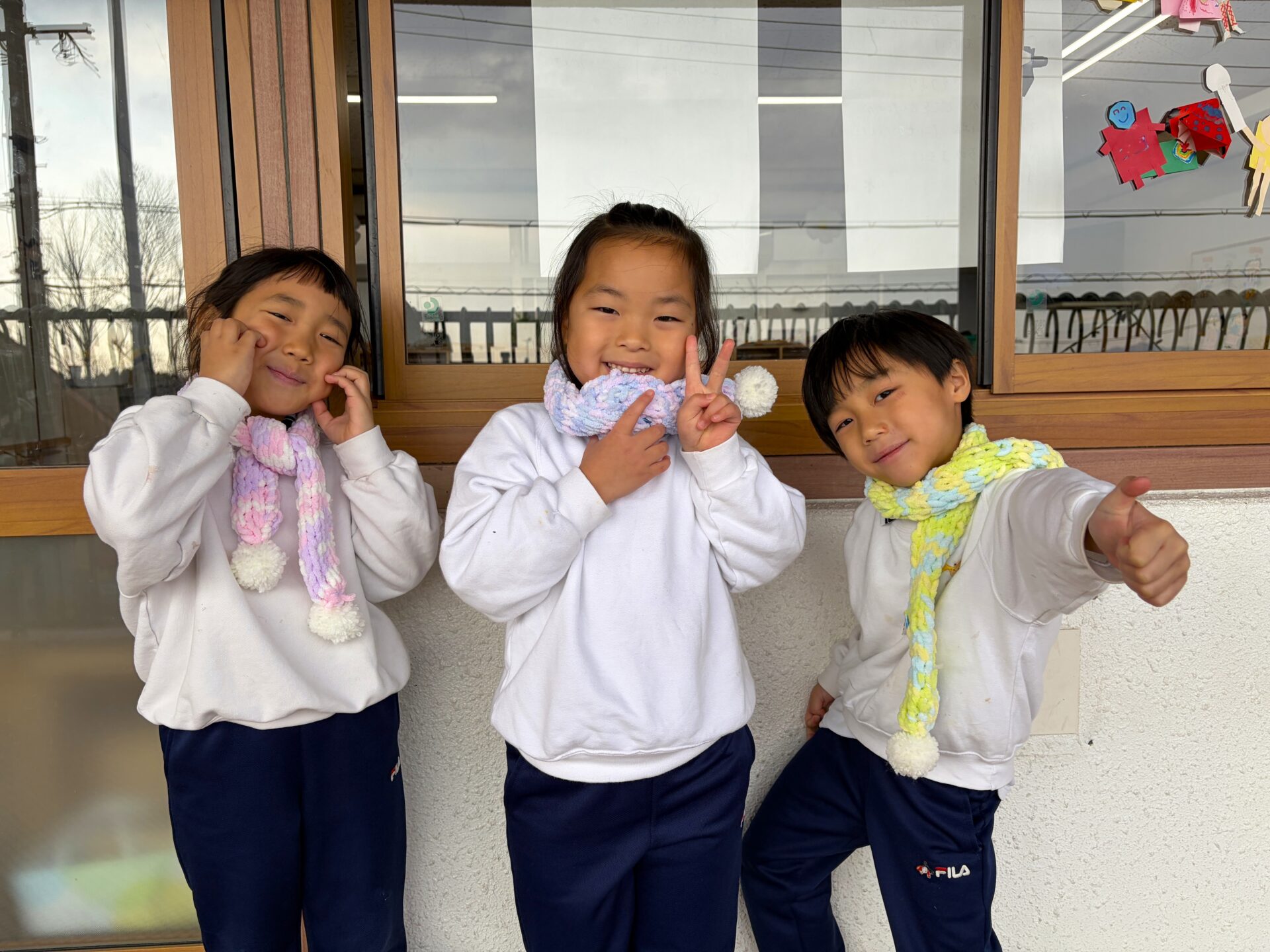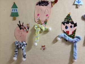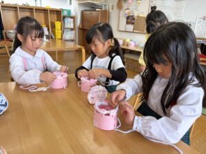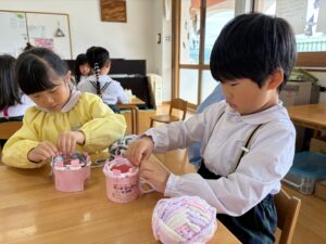 うめ(年長)組のお友だちが、マフラー作りに挑戦しました。凹凸のある土台に毛糸をひっかけて編んでいく方法に、初めは「どうやってやるの?」と苦戦していましたが、先生やお友だちに教えてもらいながら一生懸命編んでいました!できあがったマフラーをつけてみると、「あったかい〜」「ふわふわで気持ちいいね」と、にこにことうれしそうな表情を浮かべていました♪