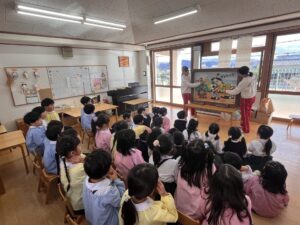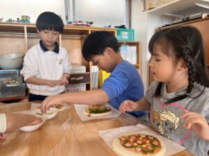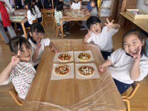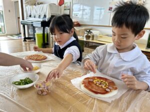 今日のお給食は米粉で作ったピザでした。ゆり(年中)組、うめ(年長)組のお友だちがトッピングに挑戦しました!前日に、大型紙芝居で米粉ピザができるまでのお話を見ていた子どもたち。読み終わった瞬間、「ぼくも作りたい!」「どんなピザにしようかな〜!」とワクワクが止まらず、今日のピザ作りを心待ちにしていました♪