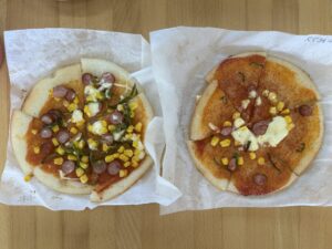 そして迎えた当日。まずは生地の上にケチャップを塗り広げ、「いいにおいしてきた!」「もっとぬっちゃおう!」と夢中になって取り組んでいました。次にコーン、ピーマン、ソーセージをトッピング!「お顔にしよっと♪」「ここにも乗せようかな?」と、お友だちと見せ合いながら楽しんでいました。最後にマヨネーズをかけて完成☆