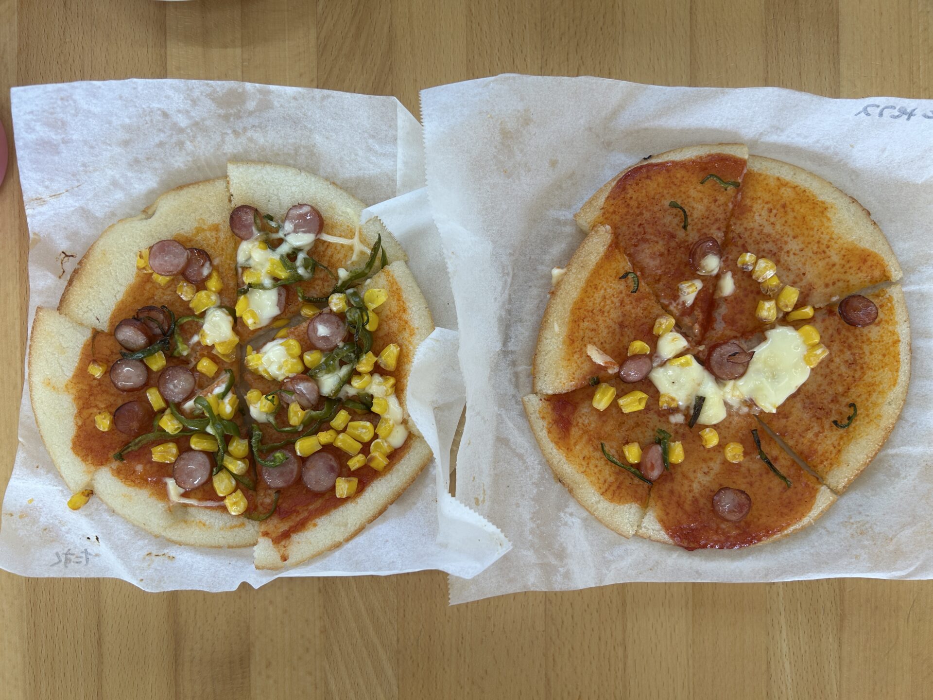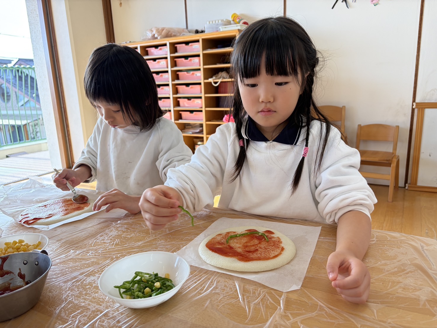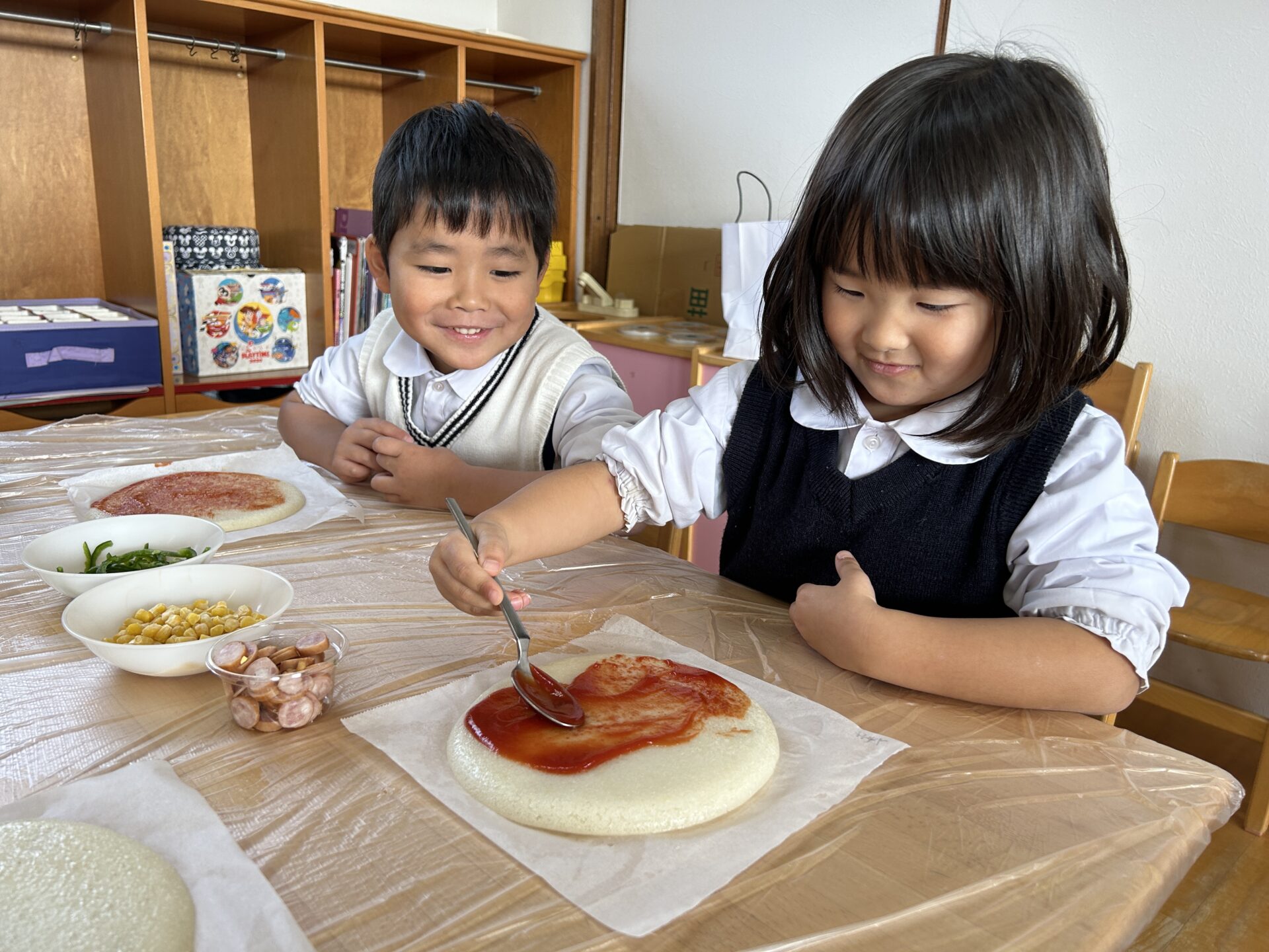 今日のお給食は米粉で作ったピザでした。ゆり(年中)組、うめ(年長)組のお友だちがトッピングに挑戦しました!前日に、大型紙芝居で米粉ピザができるまでのお話を見ていた子どもたち。読み終わった瞬間、「ぼくも作りたい!」「どんなピザにしようかな〜!」とワクワクが止まらず、今日のピザ作りを心待ちにしていました♪