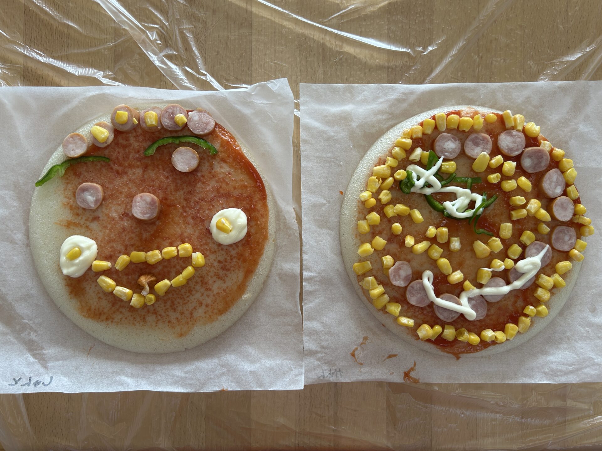 そして迎えた当日。まずは生地の上にケチャップを塗り広げ、「いいにおいしてきた!」「もっとぬっちゃおう!」と夢中になって取り組んでいました。次にコーン、ピーマン、ソーセージをトッピング!「お顔にしよっと♪」「ここにも乗せようかな?」と、お友だちと見せ合いながら楽しんでいました。最後にマヨネーズをかけて完成☆