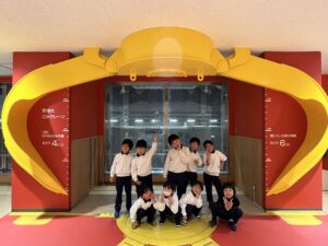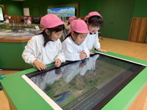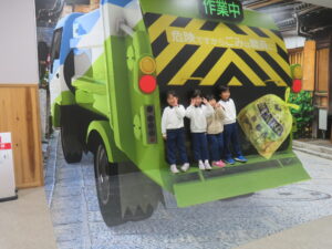うめ(年長)組のお友だちが、園外保育で南部クリーンセンター内にある環境学習施設『さすてな京都』へ行きました。はじめに『ちいさいごみしゅうしゅうしゃ ぱっくん』(作:薫くみこ・絵:オームラトモコ)という絵本を読んでもらい、その後みんなで“ぱっくん探し”に出発☆