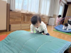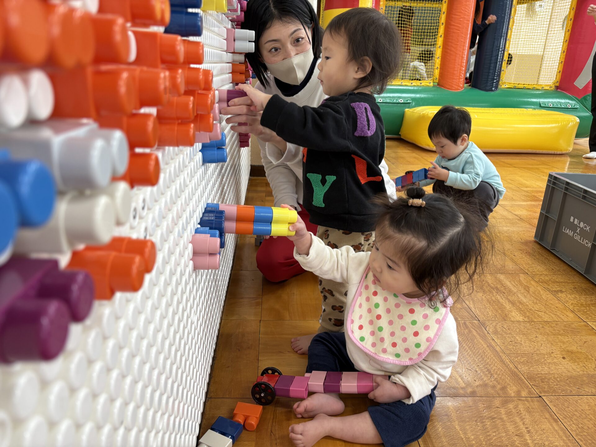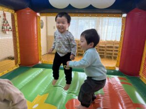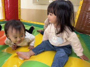 たんぽぽ1組(0歳児)とたんぽぽ2組(1歳児)のお友だちがホールで遊びました。“ふわふわランド”(空気でふくらむ遊具)では、「ジャンプ!ジャンプ!」と元気いっぱい跳びはねて大喜び♪他にも、Bブロック(底が「B」の形をしたブロック)をつなげたりボードにくっつけてみたり、マットのお山にのぼったりしながら、のびのびと遊んでいました☆