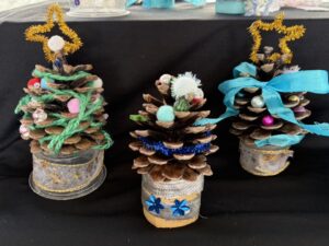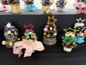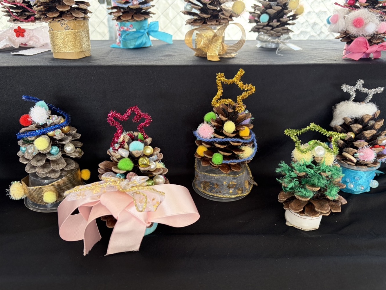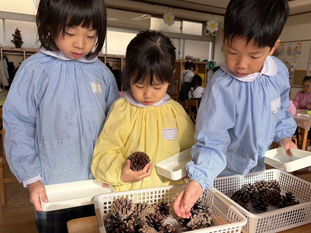 うめ(年長)組のお友だちが、先月の園外保育で訪れた「びわ湖こどもの国」で拾った松ぼっくりを使って、クリスマスツリーを作りました。松ぼっくりに綿やモール、ビーズなどで可愛く飾り付け☆「雪みたい!」「リボンもつけてみようかな!」と、ワクワクしながら作り世界にひとつだけの素敵なツリーができあがりました♪